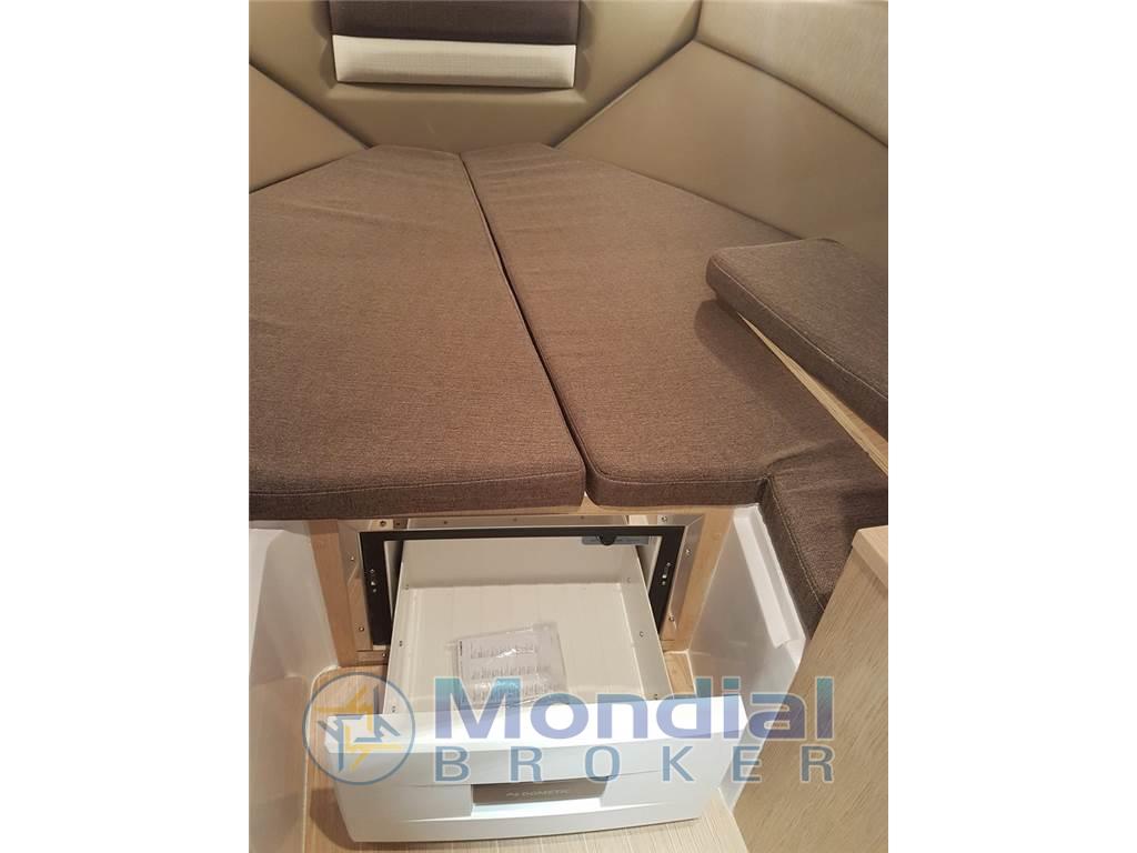 2 Oblò consolle - 2 Sedili comfort - Allestimento cabina Luxury - Aspiratore gas - Cubia ancora in acciaio inox - Cuscini cabina - Cuscino prendisole di prua - Delfiniera di prua - Impianto doccia completo - Indicatore livello carburante - Luci di navigazione - Mobili cabina in rovere dark grey - Plancette di poppa vtr con scala telescopica - Pompa di sentina con comando automatico/manuale - Porta oggetti - Redan carena HIS - Scafo bianco - Scaletta