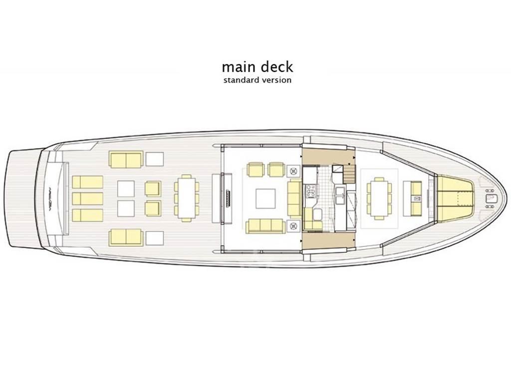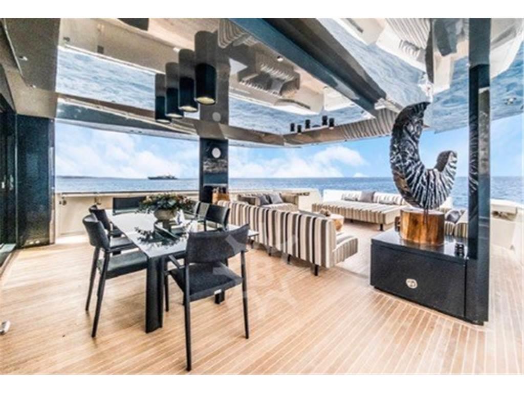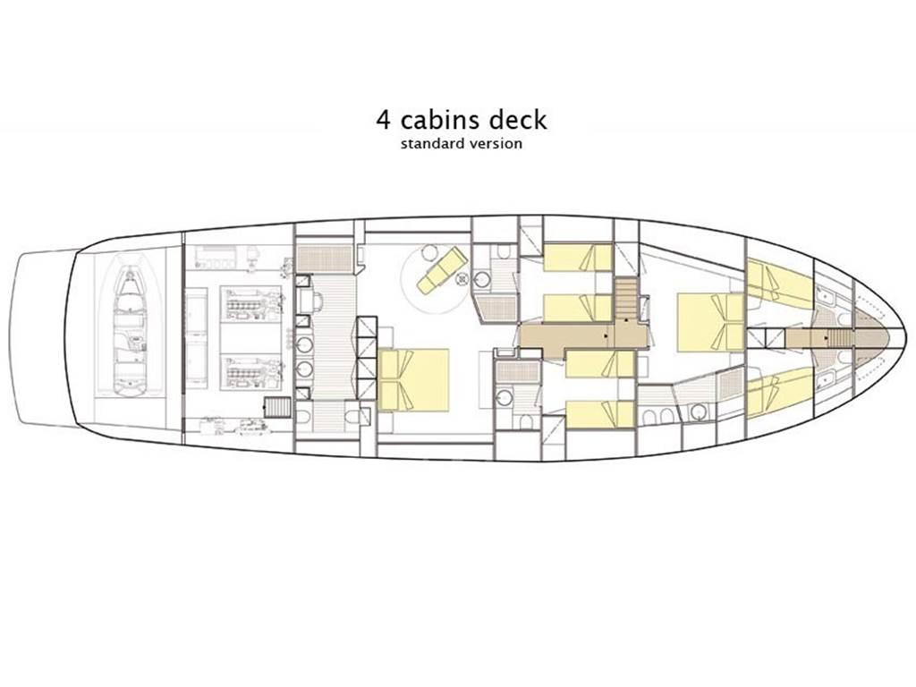 Camminamenti laterali in teak, Doccia esterna, Elica di prua - bow thruster (hydraulic), Garage per tender, Impianto Aria Compressa, Luci di cortesia, Pannelli Solari (4,5kW), Passerella (hydraulic), Piattaforma (hydraulic in teak), Pozzetto Teak, Presa 220V banchina, Presa acqua banchina, Salpa Ancore Elettrico, Scaletta da bagno, Sistema Depurazione acque nere, Stabilizzatori (hydraulic finns), Tavolo pozzetto, 2 Winch tonneggio di poppa.
