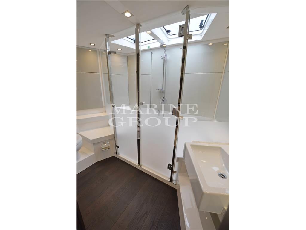 Grande salone con porte apribili e finestrature laterali a scomparsa elettricamente - Cucina equipaggiata con frigo a colonna e piastra vetroceramica - Enorme cabina armatoriale a prua con bagno ensuite - Cabina ospiti con letti doppi convertibili in matrimoniale - Cabina ospiti con letti doppi singoli - Bagno ospiti