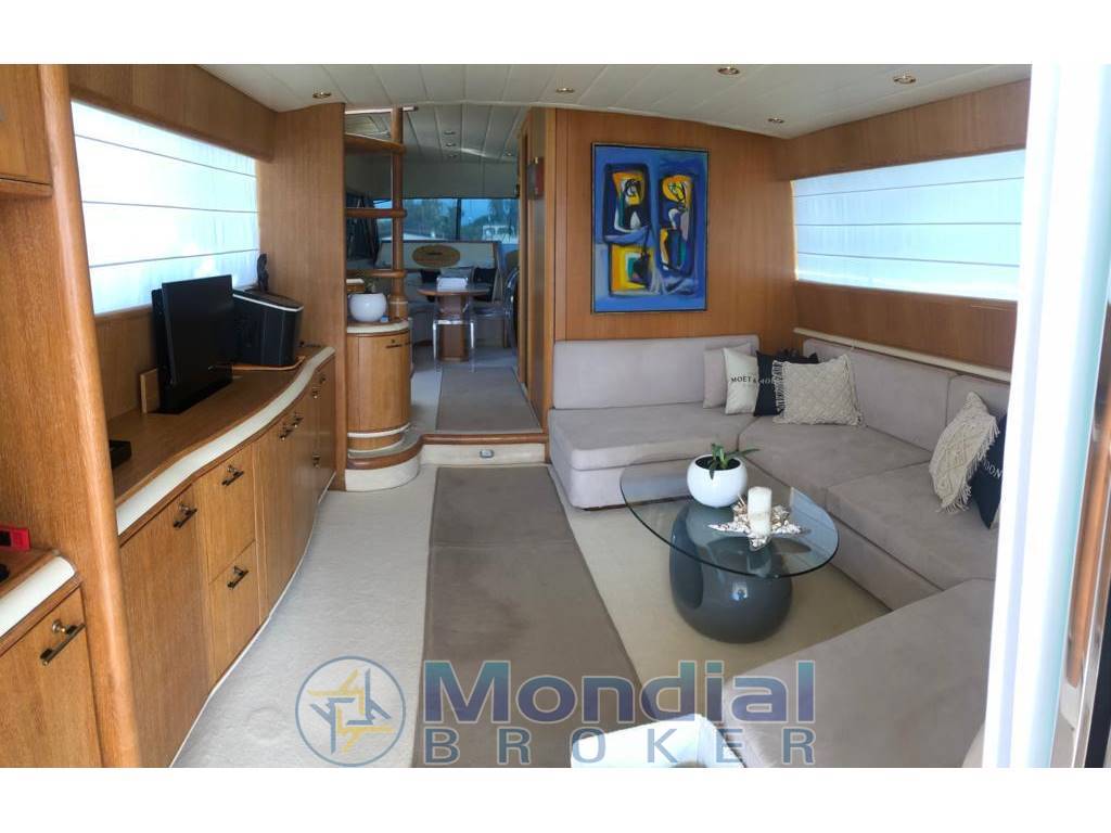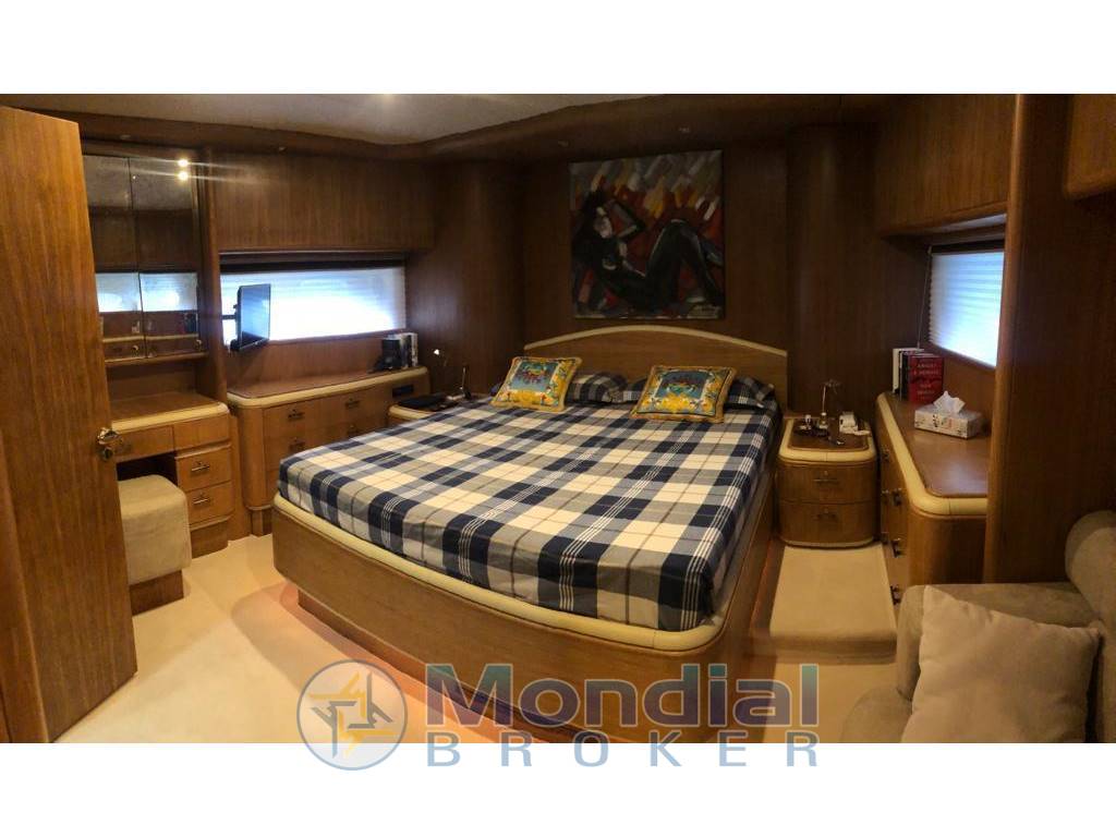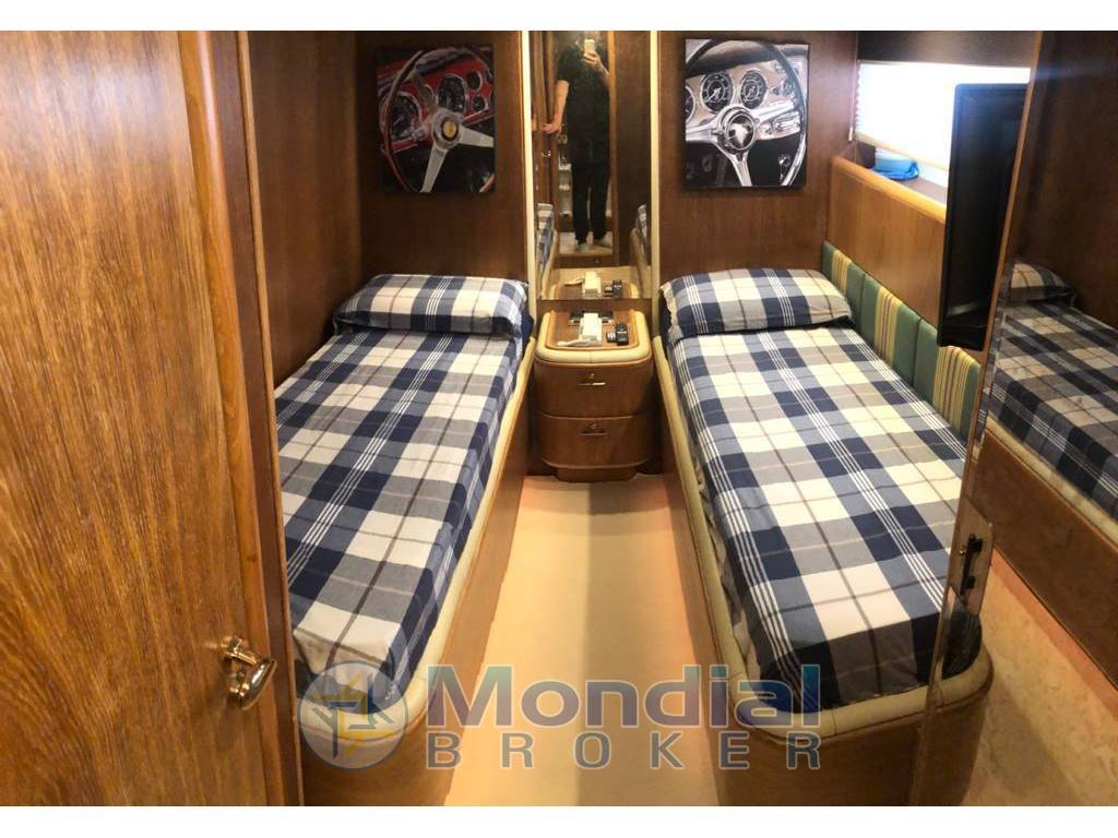 1 matrimoniale a prua, bagno separato con vasca idromassaggio e bidet, cabina armadio, 1 doppia in piano con bagno separato e doccia separata, 1 matrimoniale alla francese, con bagno separato e doccia separata, bagno di servizio uso giorno, doppia dinette, cucina separata, con forno frigo freezer, piastre in vetroceramica, cappa aspirante, scala reale per salita sul fly, cabina equipaggio a prua.