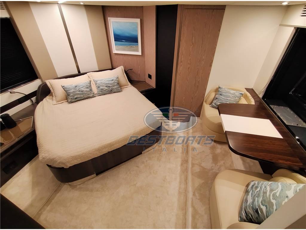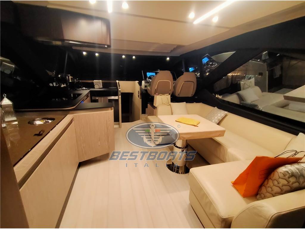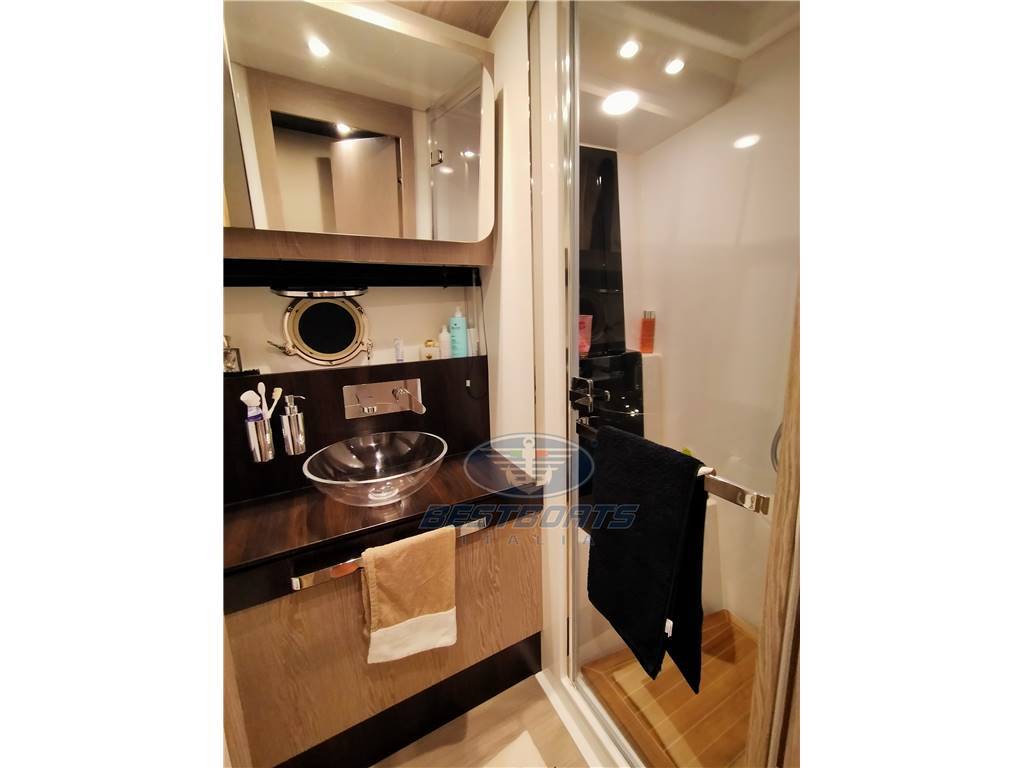 Aria condizionata (72 BTU), Bimini (Su fly e a prua con pali in carbonio), Cucina (Miele a induzione), Cuscineria completa (In Batyline), Cuscineria di prua (In Batyline), Forno (Miele), 2 Frigorifero esterno (In pozzetto e su fly), Oscuranti (Tenda elettrica per tettuccio salone), Pavimento interno in legno (Salone, dinette e discesa scale), Teli copri finestra, Tenda Elettrica (Parasole in pozzetto con inverter), WC marino manuale (Tecman con bidet integrato), Zanzariere (Oblò ), Volvo Interceptor sistem; Filtri Racor per generatore; Filtri Racor doppi; Predisposizione per desalinizzatore; Canaline elettriche supplementari; Isolatore galvanico; Mobile nel pozzetto con frigorifero, bbq e lavello; Schienale a ribalta per prendisole fly; Tetto fisso con inserti in vetro; Sistema sali e scendi per tv salone;