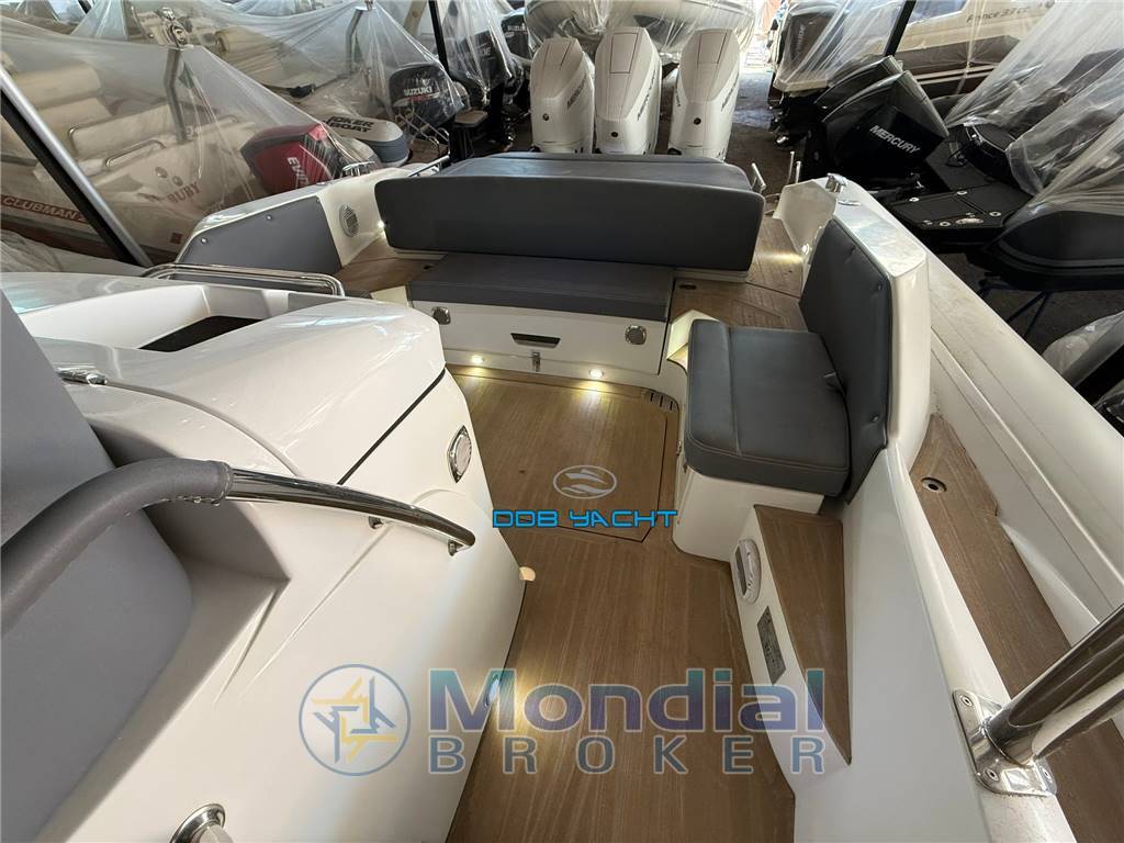 Disposizione interni ed esterni: 1 CABINA, 1 BAGNO; cabina OPEN SPACE con letto a V a prua, locale WC separato con doccia e pompa di sentina per raccolta acque grigie ATTWOOD SAHARA S 500 4505, mobili porta oggetti lato SX, plancia di comando con seduta pilota e co pilota con mobile living con lavabo, piastra in vetroceramica ELDOM e frigo a cassetto VITIFRIGO, ampio pozzetto di poppa con divani e tavolo elettrico convertibile in prendisole, ampio pozzetto di poppa e prendisole di prua con tappezzerie complete.
