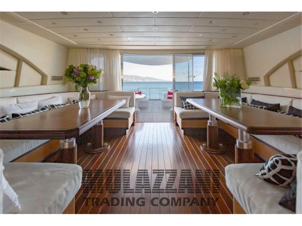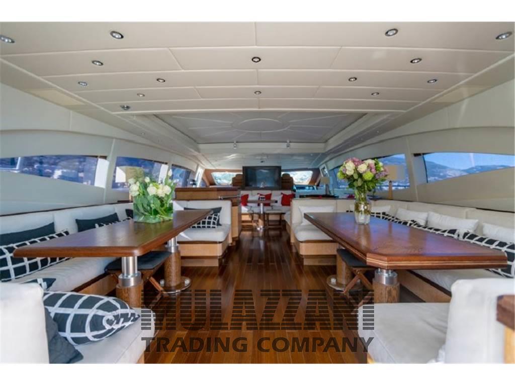 Acqua Calda, Altoparlanti, Antenna Satellitare TV, Aria condizionata (FRIG-IT 380V/50 Hz/3ph 155.770 BTU/h), Asciugatrice, Barometro, Boiler, Cassaforte, Cassetta di pronto soccorso, Clima reversibile, Collegamento internet, Collegamento internet satellitare, Congelatore, Cucina, Cuscineria completa, Cuscineria di poppa, Cuscineria di prua, Cuscineria fly, Cuscineria Pozzetto, Dissalatore (Idromar 300l/h), Dotazioni di sicurezza oltre 50 miglia, E.P.I.R.B., Forno, Frigorifero esterno, Frigorifero interno, 30 Giubbetti di salvataggio, ICE Maker, Impianto acque nere, Impianto TV, Indicatore del serbatoio del carburante, Indicatore del Serbatoio dell’Acqua, Indicatore del Serbatoio delle Acque Reflue, Indicatore della pressione dell’olio nel motore, Indicatore della temperatura del motore, Inverter, Lavatrice, Microonde, Piastra elettrica, Prese interne 220v, Riscaldamento, Salvagente anulare con cima munita di boetta luminosa, Serbatoio Acque Nere, Stereo, 3 Telecamera (di sicurezza CCTV), Teli copri finestra, 7 WC marino elettrico, 2 Zattera di salvataggio (Arimar ( tipo 1=8persone )), Sistema di controllo e monitoraggio della propulsione MTU BLUE VISION