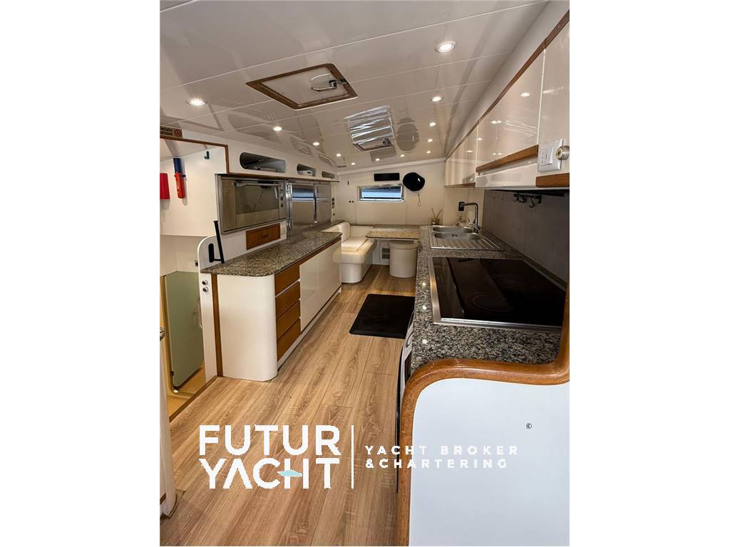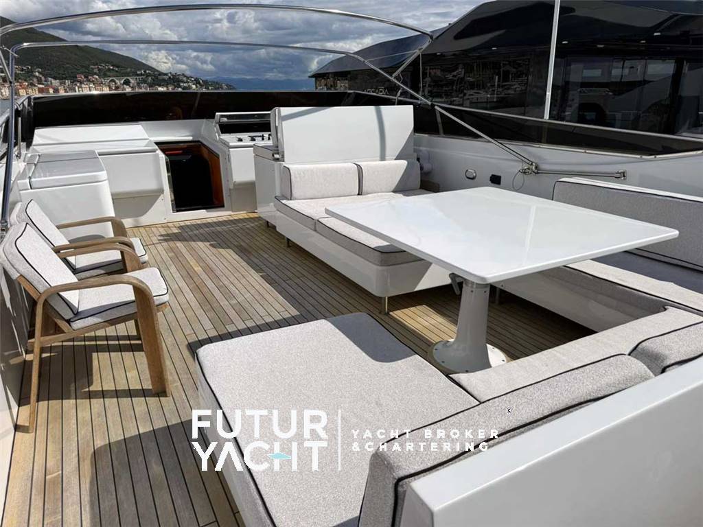 Lo yacht è suddiviso in tre ponti: attraverso la passerella di poppa si accede a un grande pozzetto, dove la zona pranzo interamente protetta dalla sovrastruttura del flybridge, è molto accogliente e perfettamente allestita per accogliere gli ospiti. Dai passavanti laterali, ampi e ben protetti dalle possenti falchette, si raggiunge il solarium di prua con grande sofa bed che si estende nella sezione prodiera della tuga.