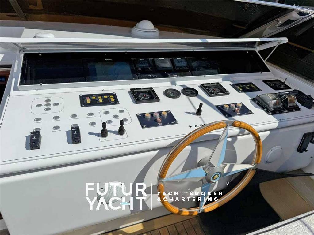 Doppia timoneria, Elica di prua - bow thruster (HYDRO SYSTEM 85 cv), Faro orientabile, Flap idraulici, Gruette per tender su fly, Impianto antincendio, Luci di cortesia, Luci subacquee, Piattaforma, Porta ingresso, Pozzetto Teak (+ teak fly), Stabilizzatori (fins CMC MARINE srl type SE 060-120HS ZERO SPEED), 2 Tavolo pozzetto, Tromba, 2 Winch tonneggio di poppa.