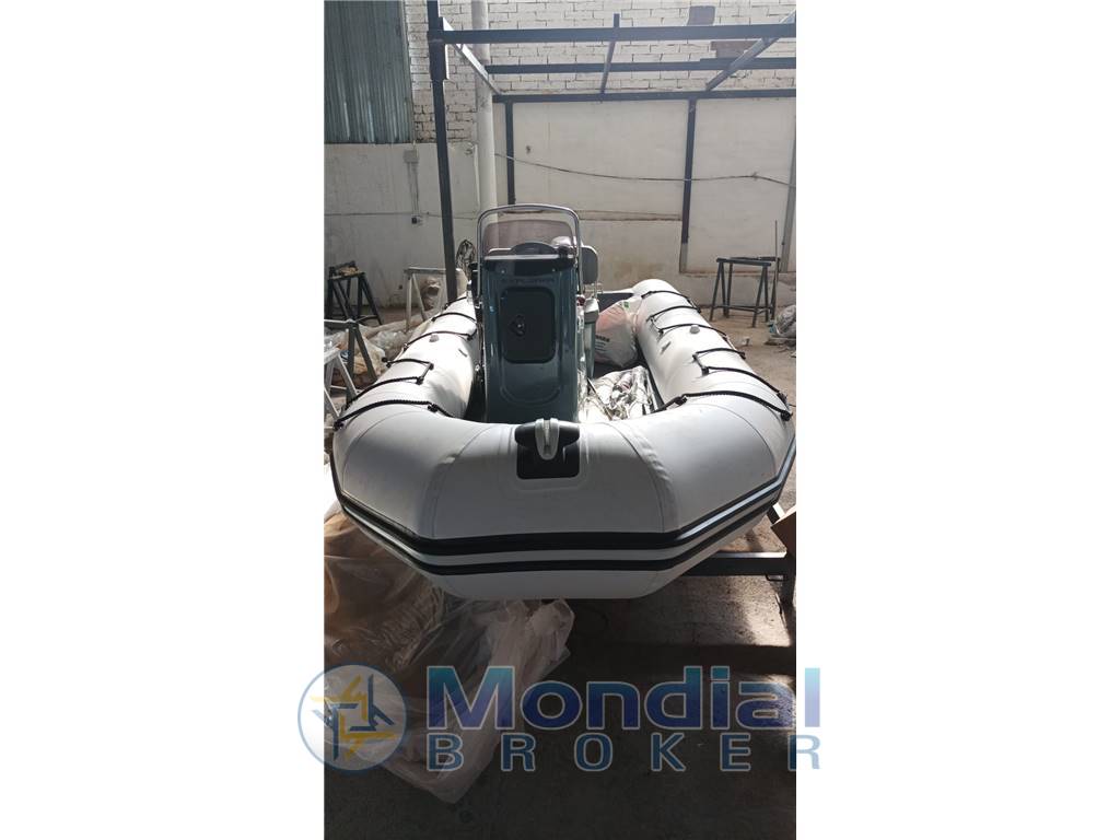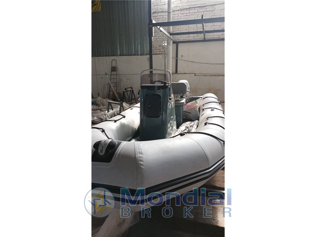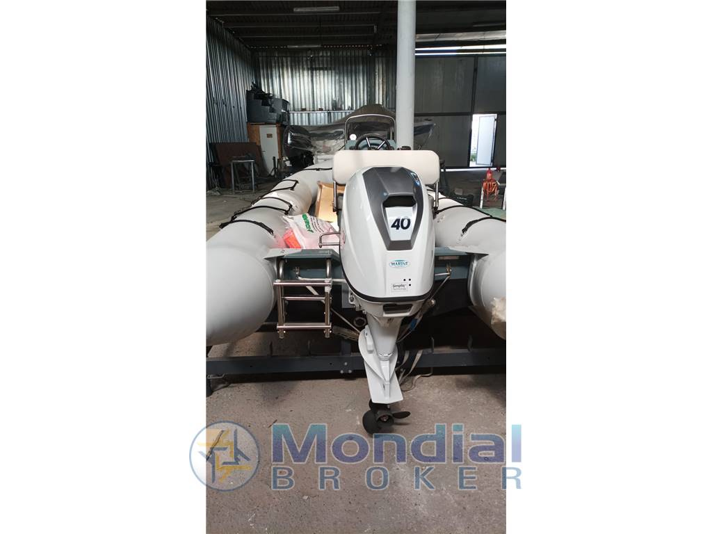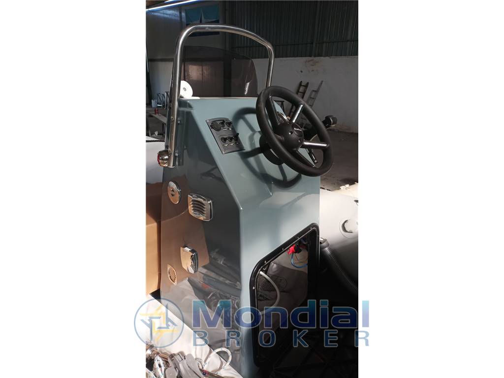 consolle Optima 800 colore grigio, sedile doppio, ancora ad ombrello da 6 kg con cima, impianto elettrico 12 v con pannello interruttori, asta 360°, luci di via, tromba, pompa di sentina in automatico, dotazioni di sicurezza ed ormeggio, scaletta in acciaio a 3 gradini, prefiltro benzina, presa usb in consolle, commissione a parte