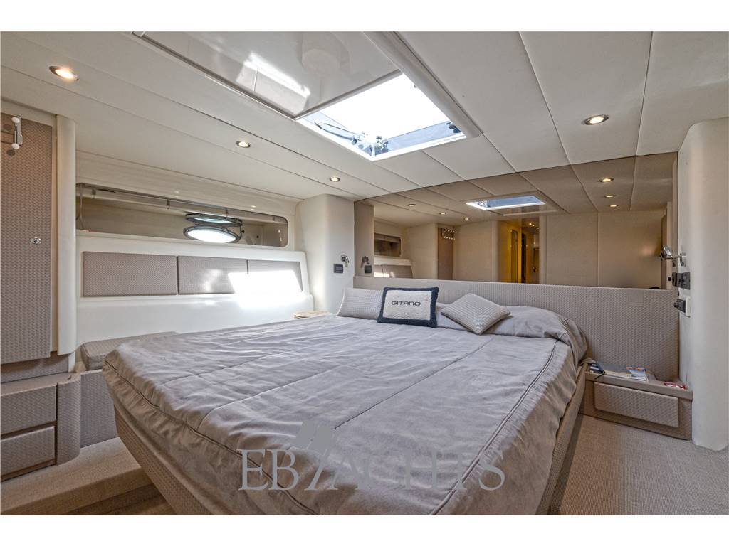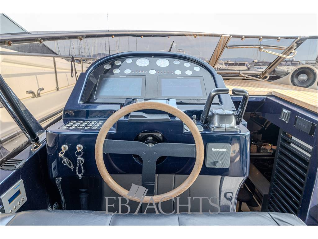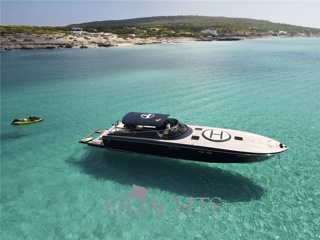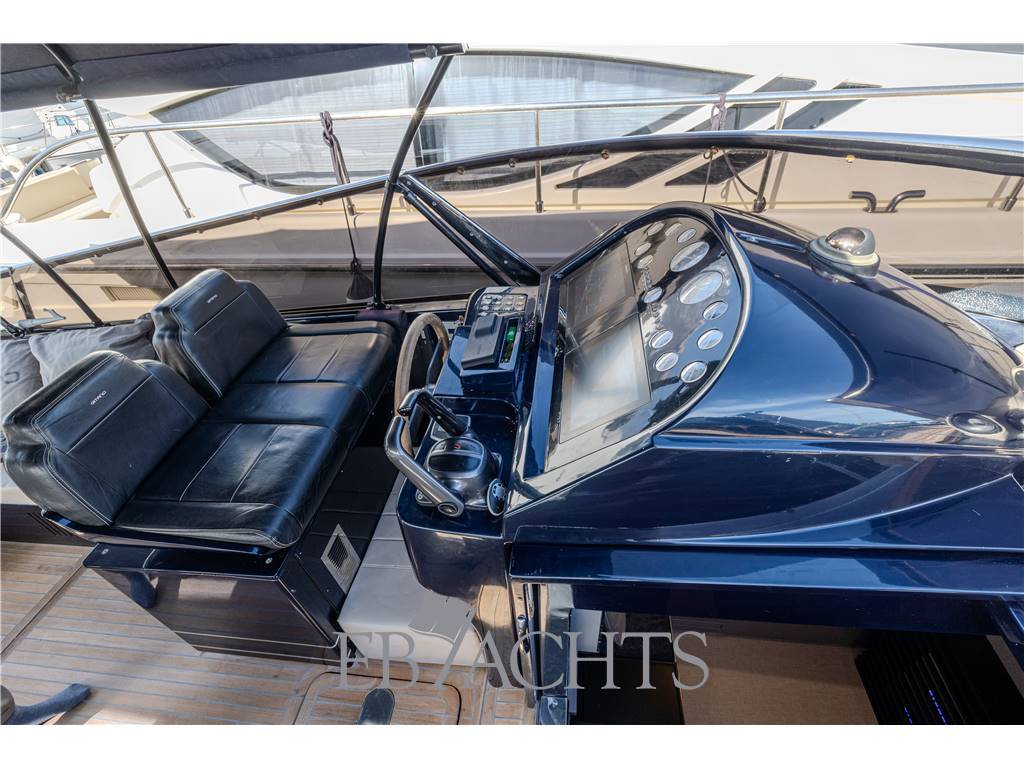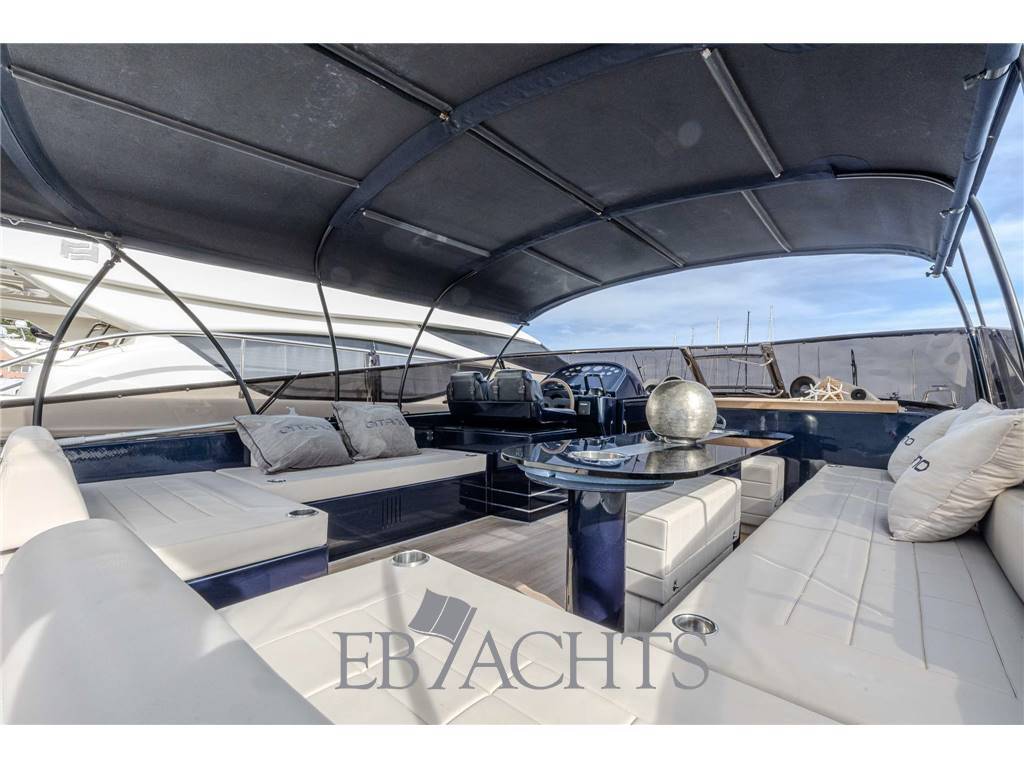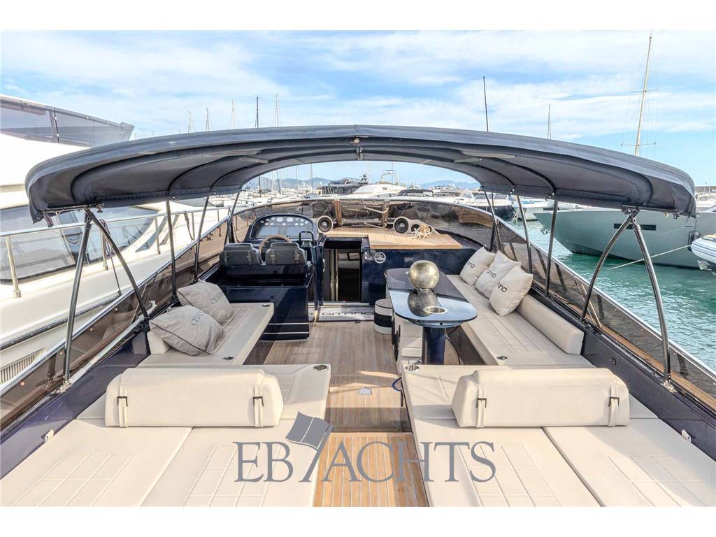 Pozzetto ridisegnato con sedute profonde e tavolo in cristallo fumé, accesso a prua agevolato da un’apertura centrale nel parabrezza, prendisole poppiero con passaggio centrale e coperta in teak con prendisole circolare.