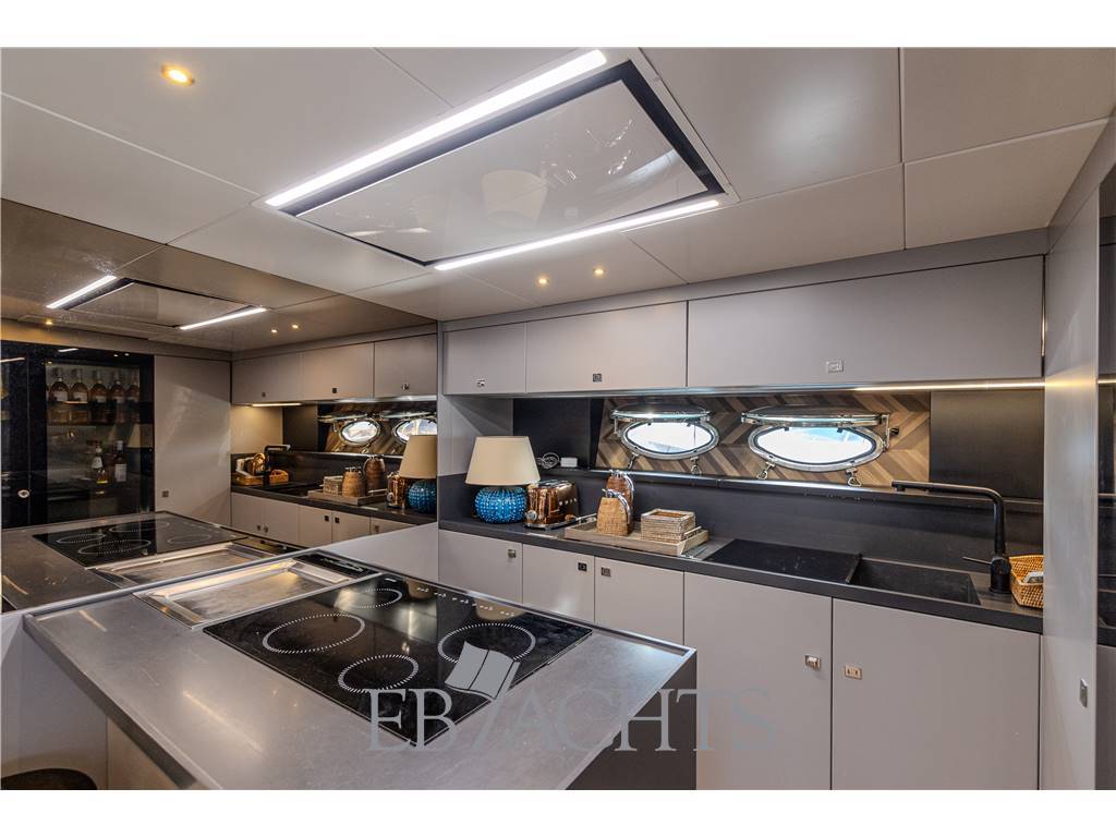 Sottocoperta, un raffinato open-space ospita cucina con penisola, divano, cabina armatoriale di design e una nursery convertibile. A poppa con accesso separato troviamo la cabina ospiti con bagno.