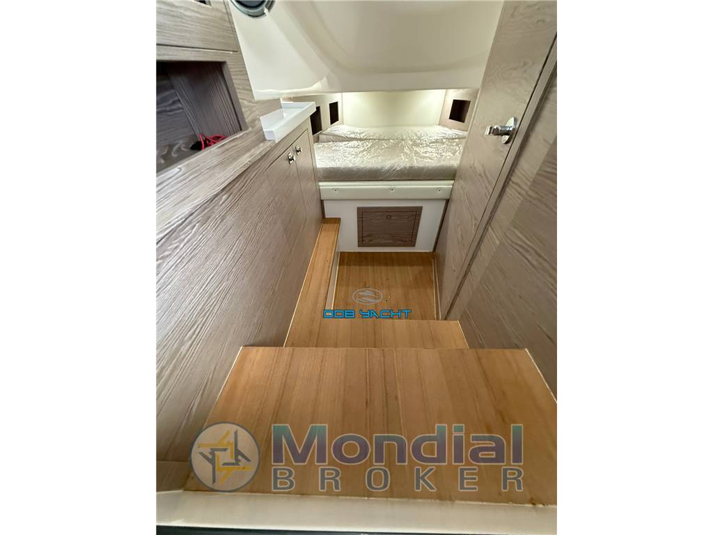 cabina open space con letto a V a prua, locale WC separato; ampio prendisole di poppa con divani corredati di tappezzerie e con tavolo con prolunghe, plancia comando con seduta pilota e co pilota, mobile con lavabo, tagliere e doppio frigo VITIFRIGO DW51RF0CX2, prendisole di prua.