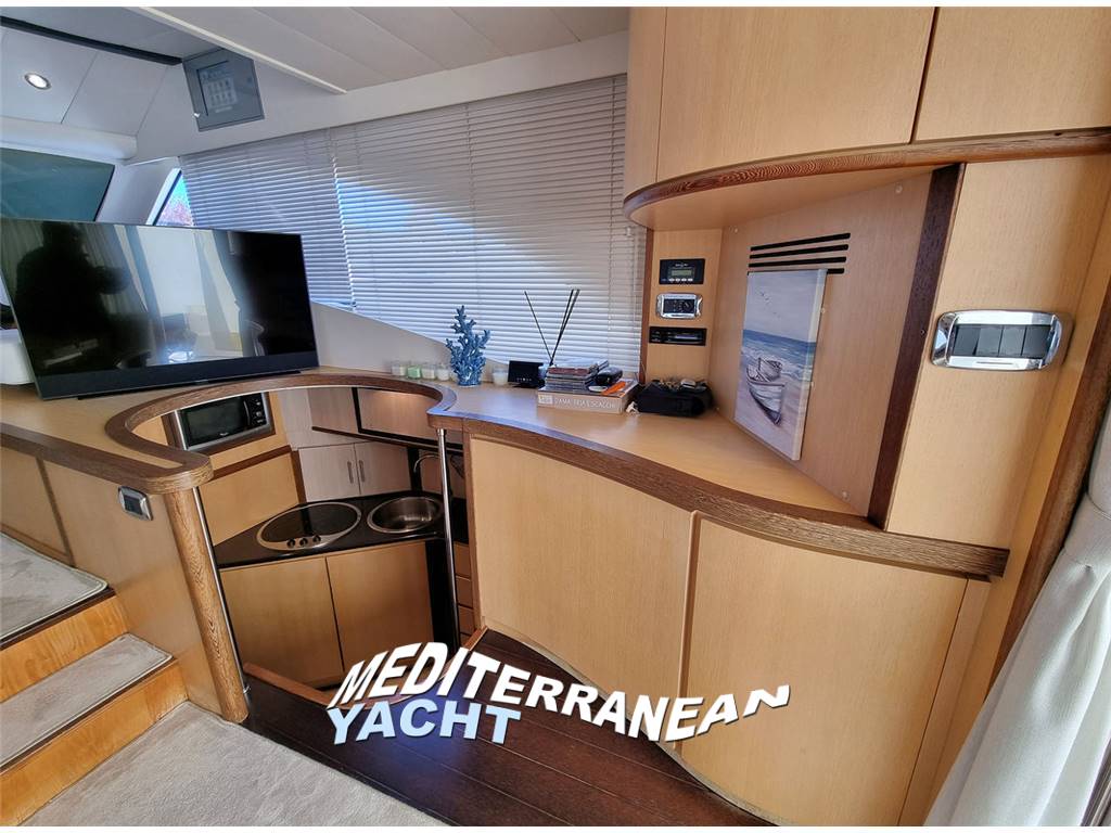 - Salone con divano a "C" e tavolo ampliabile, mobile contrapposto; cucina in basso DX con piano cottura in vetroceramica, frigo/freezer a colonna, forno microonde e lavello; dinette lato SX con divano a "C" e tavolo, timoneria contrapposta, scala discesa alle cabine