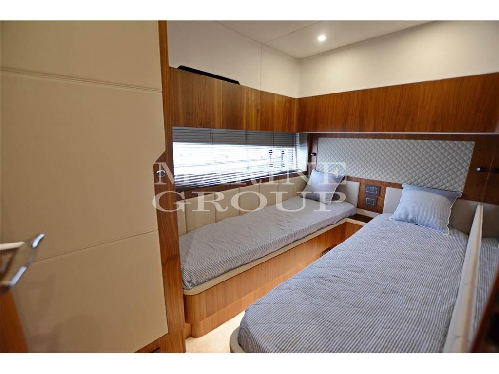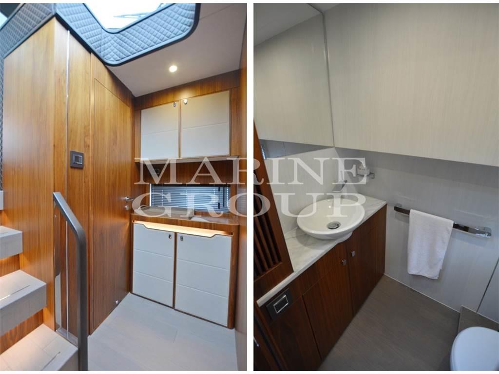 Interni in essenza di Noce satinato - Parquet in Rovere - Rivestimenti interni pelle pieno fiore Bentley - Grande salone con tavolo elettrico - Cucina equipaggiata - Cabina armatoriale a centro barca con bagno ensuite - Cabina VIP a prua con bagno ensuite - Cabina ospiti con due letti singoli con bagno ensuite - Disimpegno con quarto bagno per uso giornaliero - Cabina equipaggio a poppa per una persona completa di bagno.
