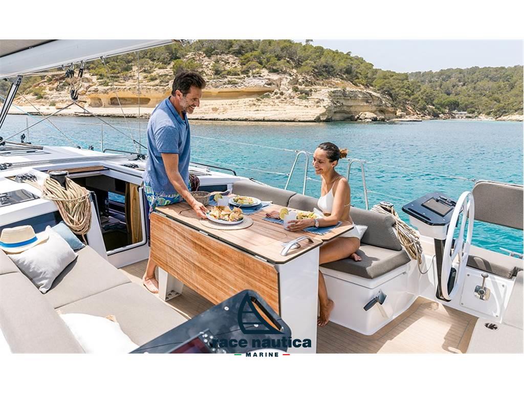 Ocean version, full batten mainsail and self-tacking jib in Dacron, mainsail sheet on deckhouse with ropes (no traveller), 2 winches on deckhouse with organisers and stoppers, continuous reefing system in cockpit, bow roller, 1000w remote control windlass, lazy bag + lazy jacks, rigid vang, Ambiance signature, Yanmar 57HP Sail-Drive engine supplement, Bow tunnel propeller, Zeus Ultra Wide 12‘ screen on the left, Zeus Ultra Wide 12’ screen on the right, autopilot, VHF V20S, WR10 remote control, VHF V60-B with integrated AIS, T45 electric winch on the deckhouse, 2 additional opening portholes in the aft cabins on the cockpit side, bimini, Sprayhood with handrail, 20kg anchor kit + 30m of 10mm chain + 40m of rope, 6 fenders, 3 mooring ropes, Difference for 50m chain instead of rope, Classic cushions, Gas barbecue plate in the bench, external cockpit sink, Second additional 180l fresh water tank not compatible with watermaker.