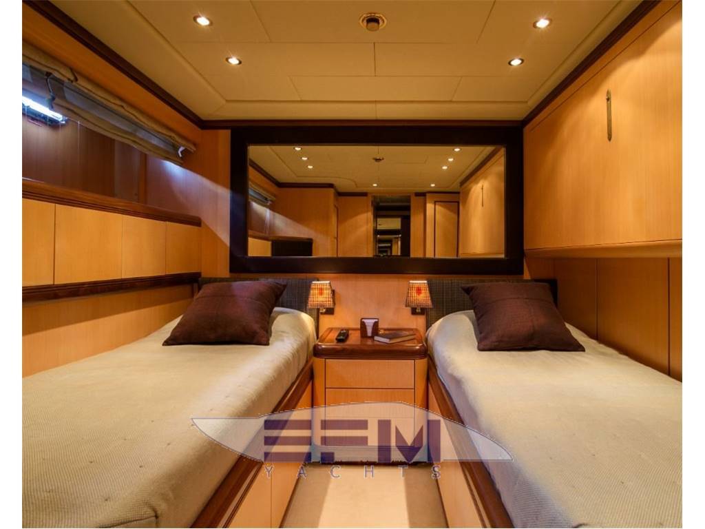 She comprises a master suite, 1 double cabin and 2 twin cabins. The aft deck has a large sunpad and dining table, whilst inside the main saloon is a bar, serving area and built-in seating.