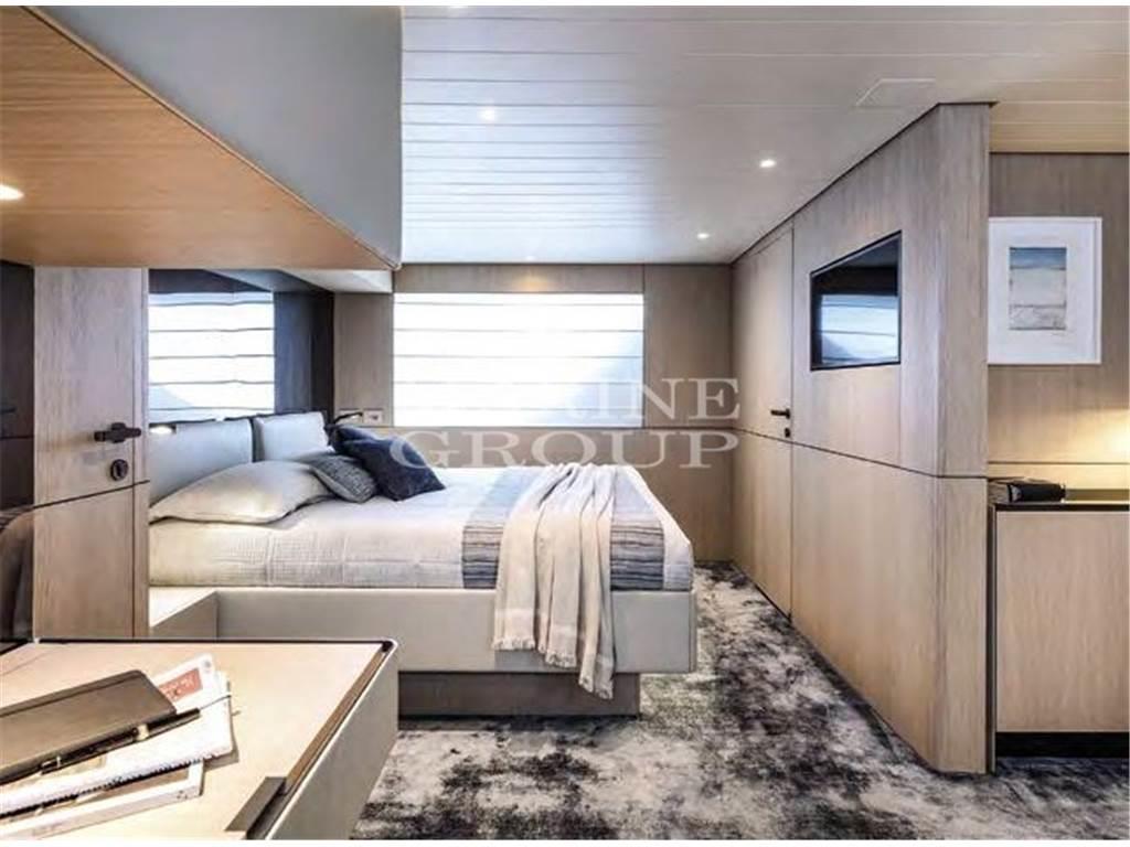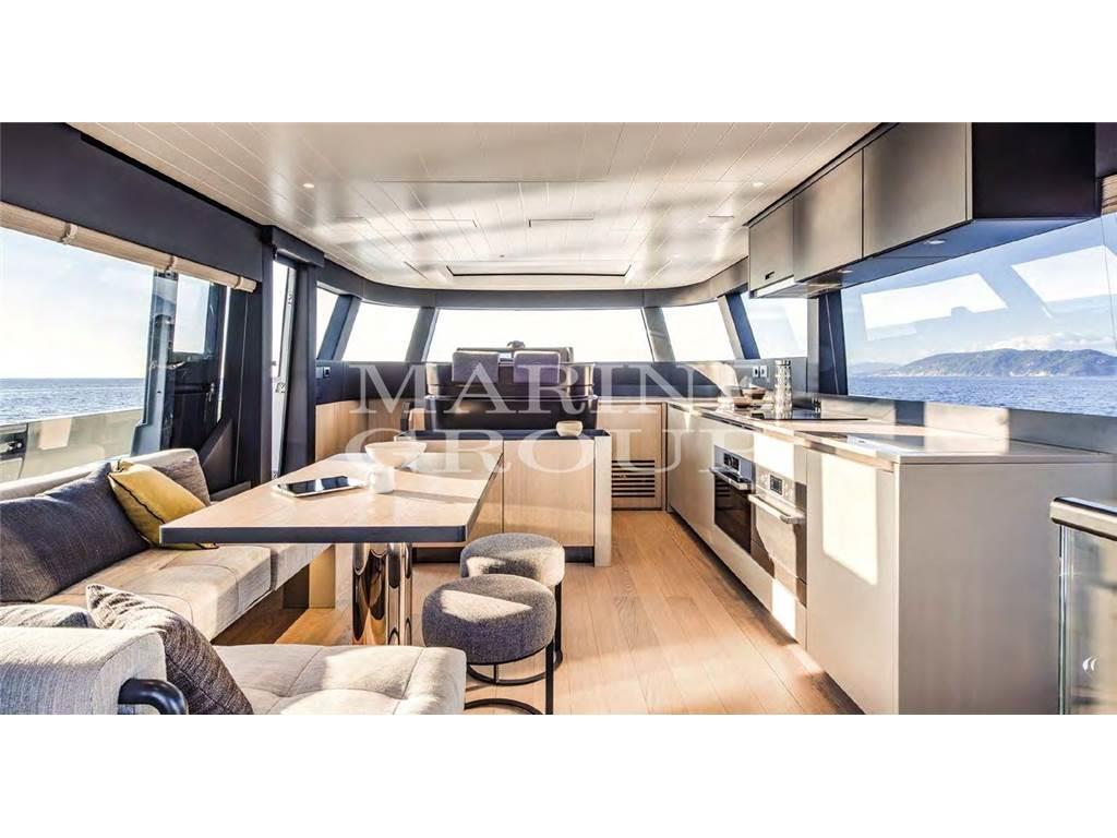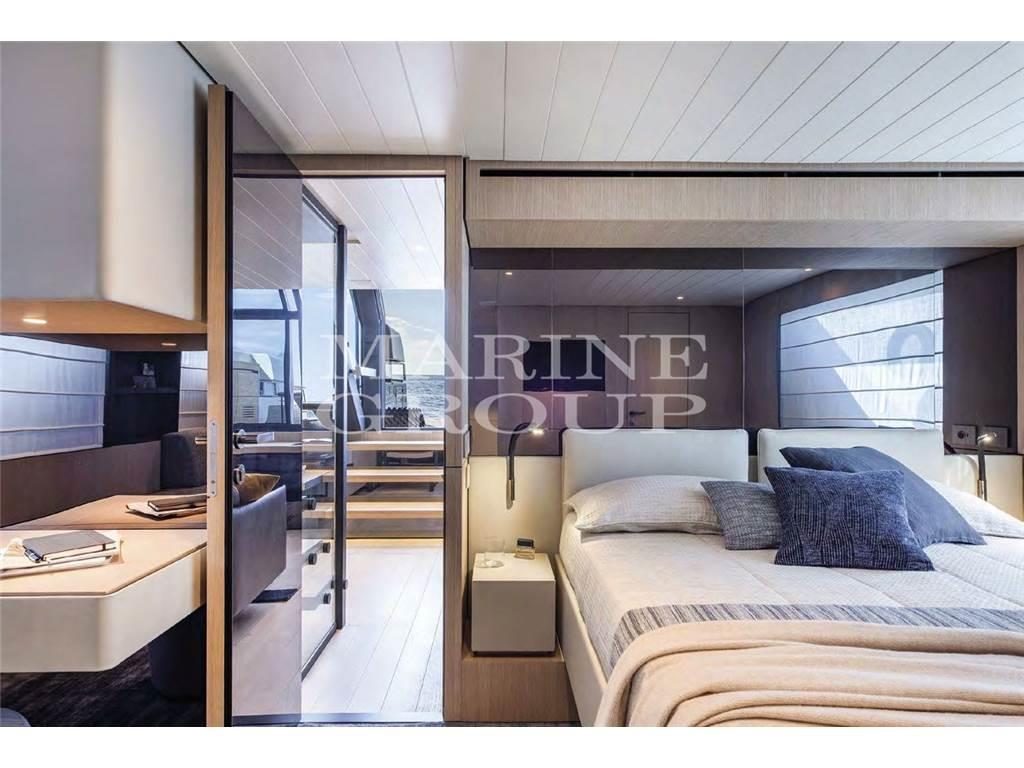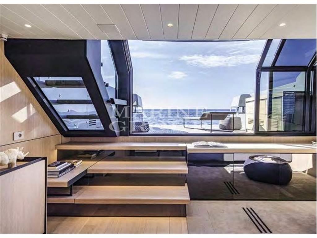 Interni luminosi, razionali ed estremamente spaziosi; Finiture di alta qualità con materiali raffinati anche nei punti nascosti; Attraverso vetrate scorrevoli si accede al luminoso salone del ponte inferiore con vetrate a scafo, divano-letto e tv a scomparsa; Cucina spaziosa, ben organizzata e totalmente attrezzata e ampia zona living; cabina armatoriale da superyacht con bagno ensuite completo; Cabina VIP a prua sul ponte inferiore dotata di assoluta privacy completa di bagno privato; cabina ospiti con letti singoli a "L"; Cabina equipaggio a prua con letto singolo e toilette completa.