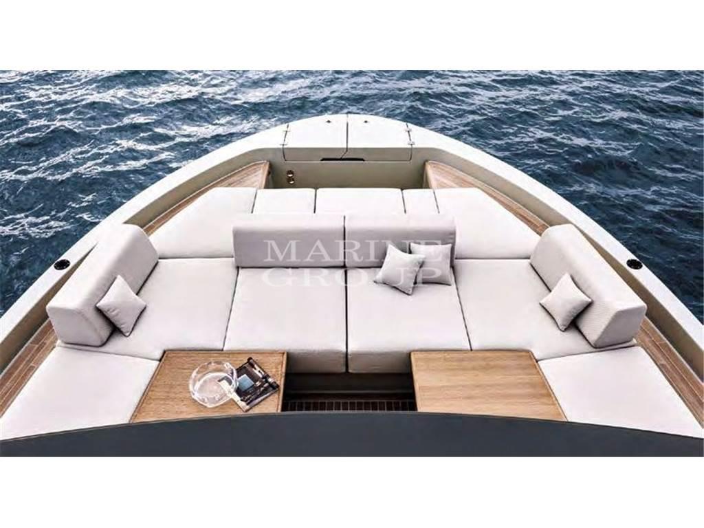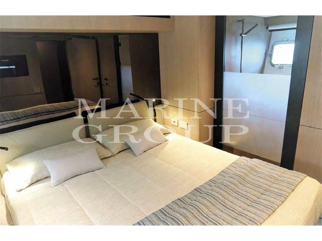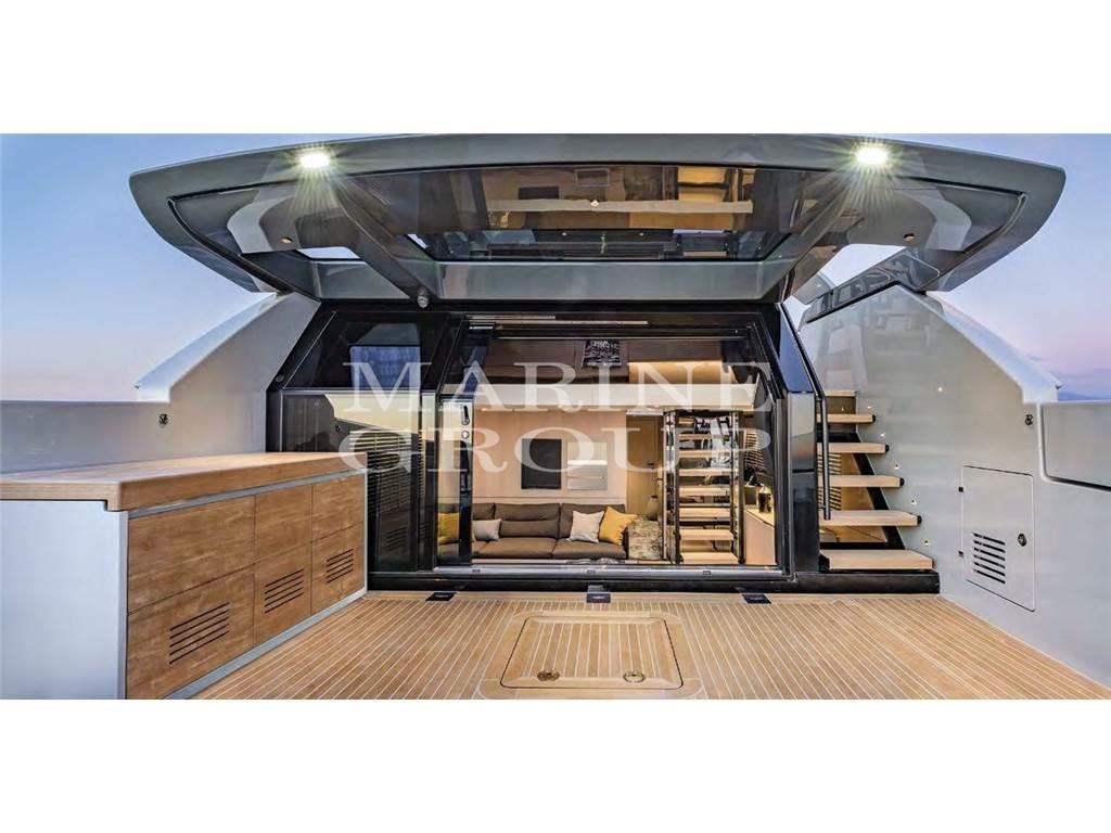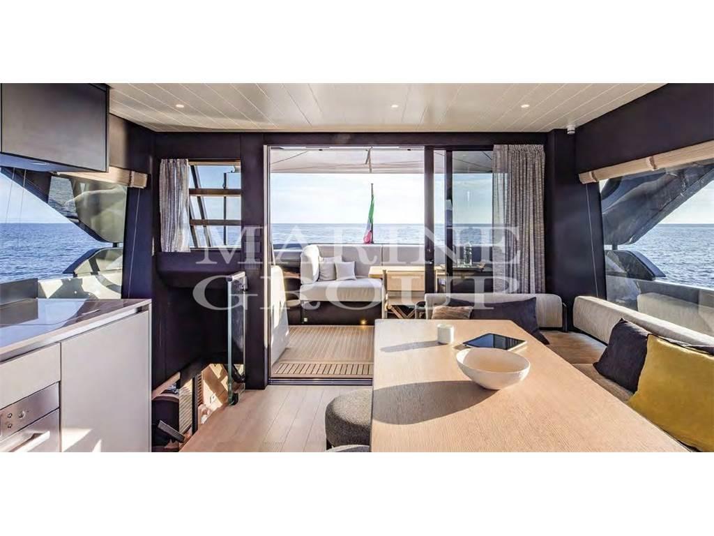 Interni luminosi, razionali ed estremamente spaziosi; Finiture di alta qualità con materiali raffinati anche nei punti nascosti; Attraverso vetrate scorrevoli si accede al luminoso salone del ponte inferiore con vetrate a scafo, divano-letto e tv a scomparsa; Cucina spaziosa, ben organizzata e totalmente attrezzata e ampia zona living; cabina armatoriale da superyacht con bagno ensuite completo; Cabina VIP a prua sul ponte inferiore dotata di assoluta privacy completa di bagno privato; cabina ospiti con letti singoli a "L"; Cabina equipaggio a prua con letto singolo e toilette completa.