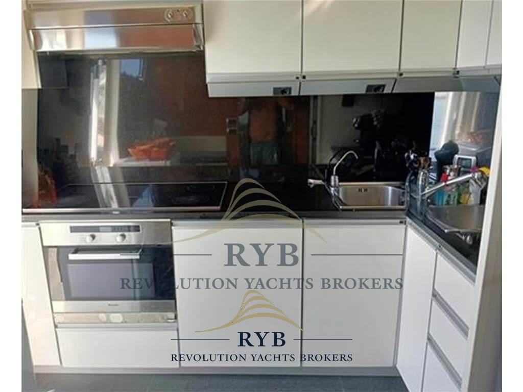 La cucina, dotata di accesso diretto al camminamento laterale, è attrezzata con elettrodomestici di alta gamma: Doppio lavello, Frigorifero americano, Forno Miele, Piano cottura elettrico, Lavastoviglie, Tritarifiuti, Timoneria