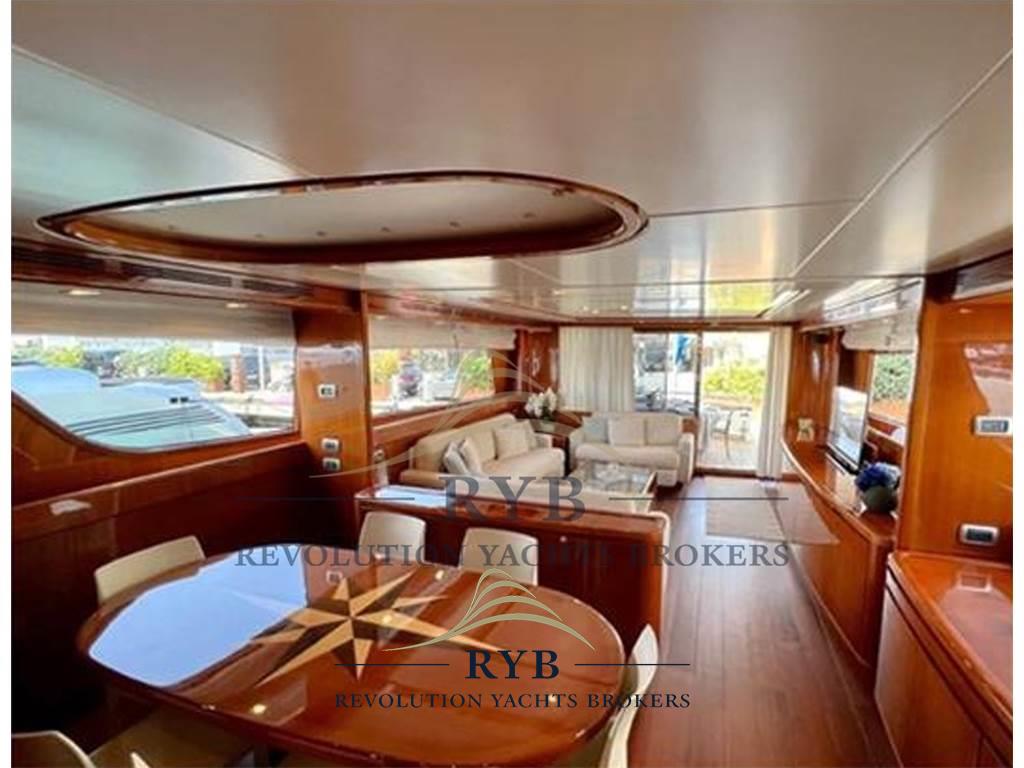 Adiacente al salone, la zona pranzo è arredata con un ampio tavolo e sedie, perfetta per momenti conviviali. Dal disimpegno, si accede sia al camminamento laterale che alle scale che conducono al ponte cabine e al flybridge.