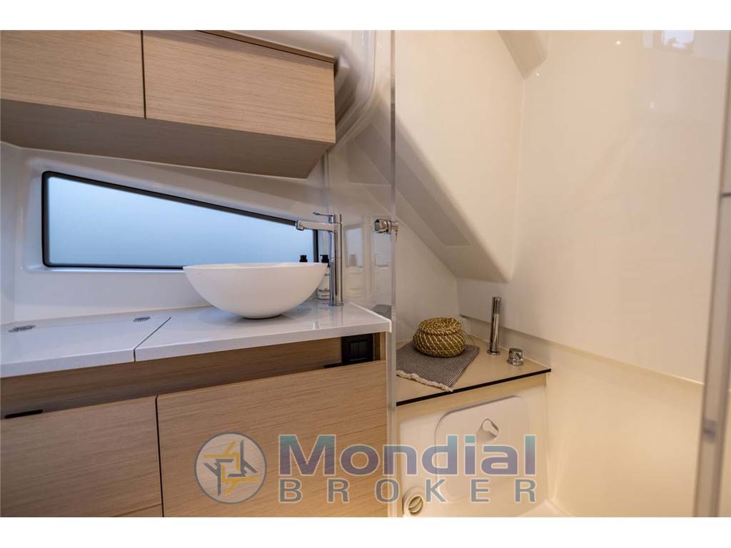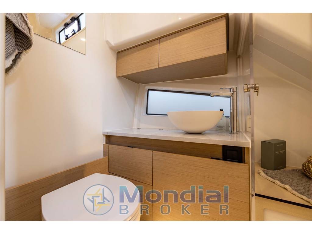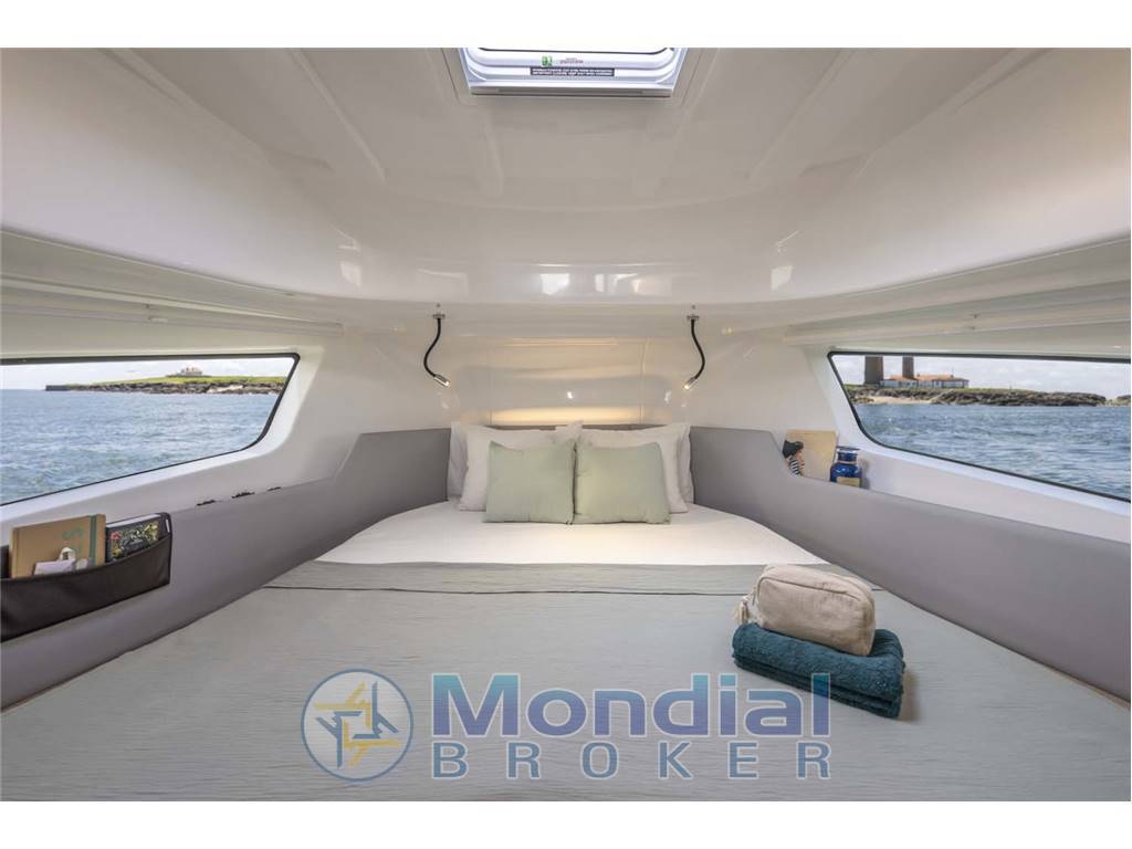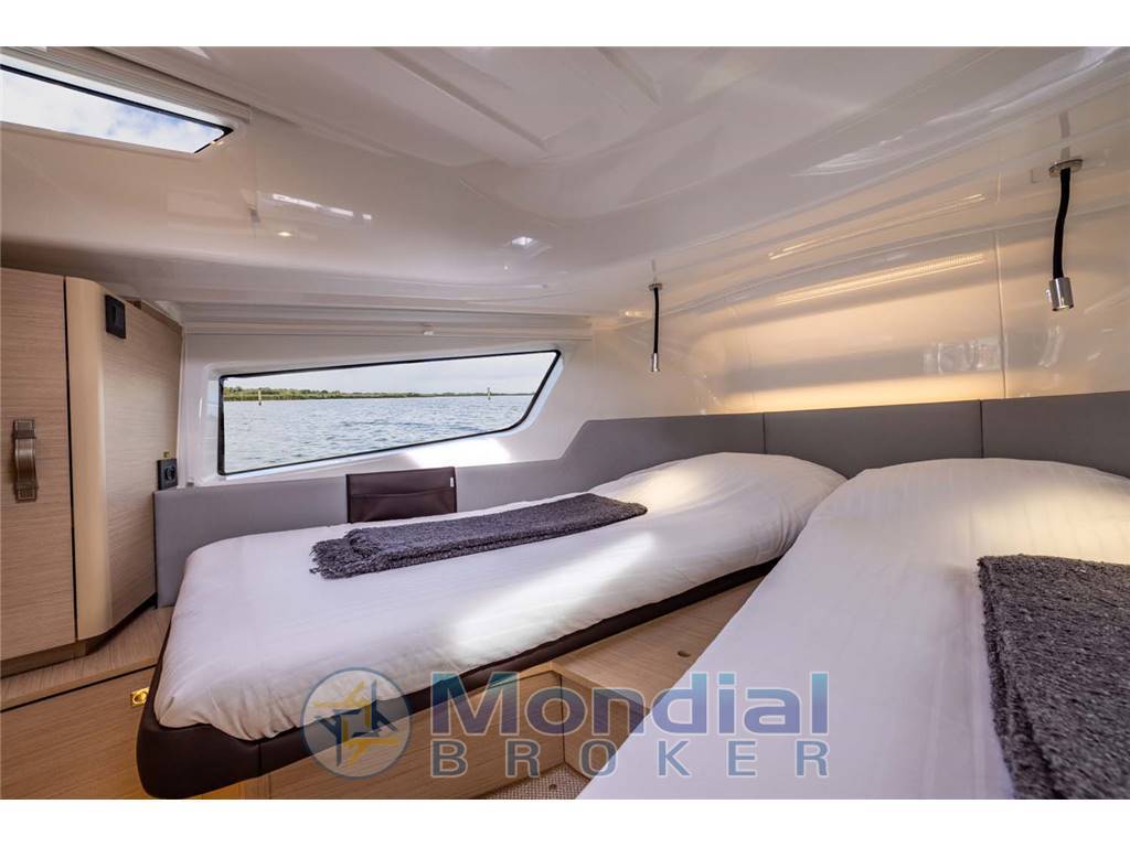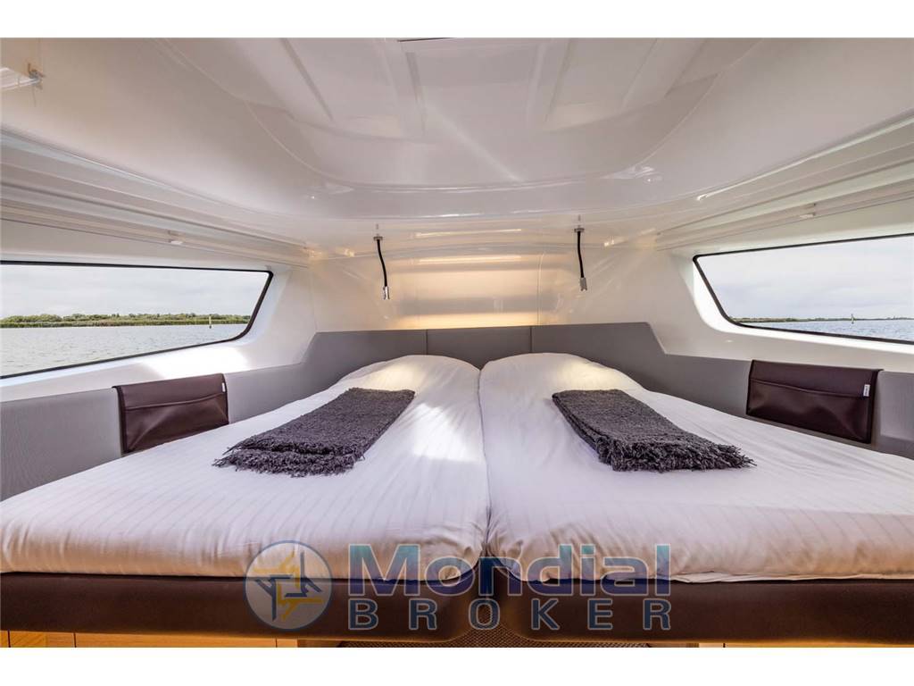 La cabina armatoriale è a tutto baglio, e il letto può essere aperto in 2 letti singoli oppure composto in un matrimoniale. Il bagno è grande, rifinito, con una cabina doccia separata a tutta altezza. La seconda cabina può essere configurata come seconda cabina letto, oppure cabina armadio con un locale studio/ufficio. La dinette ha un enorme divano a C comodo per ospitare tutti gli ospiti attorno ad un tavolo convertibile.