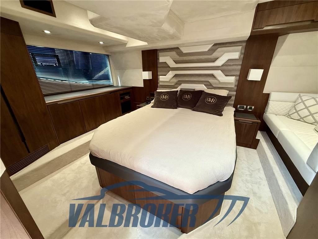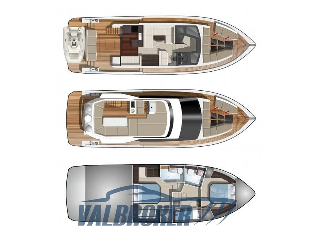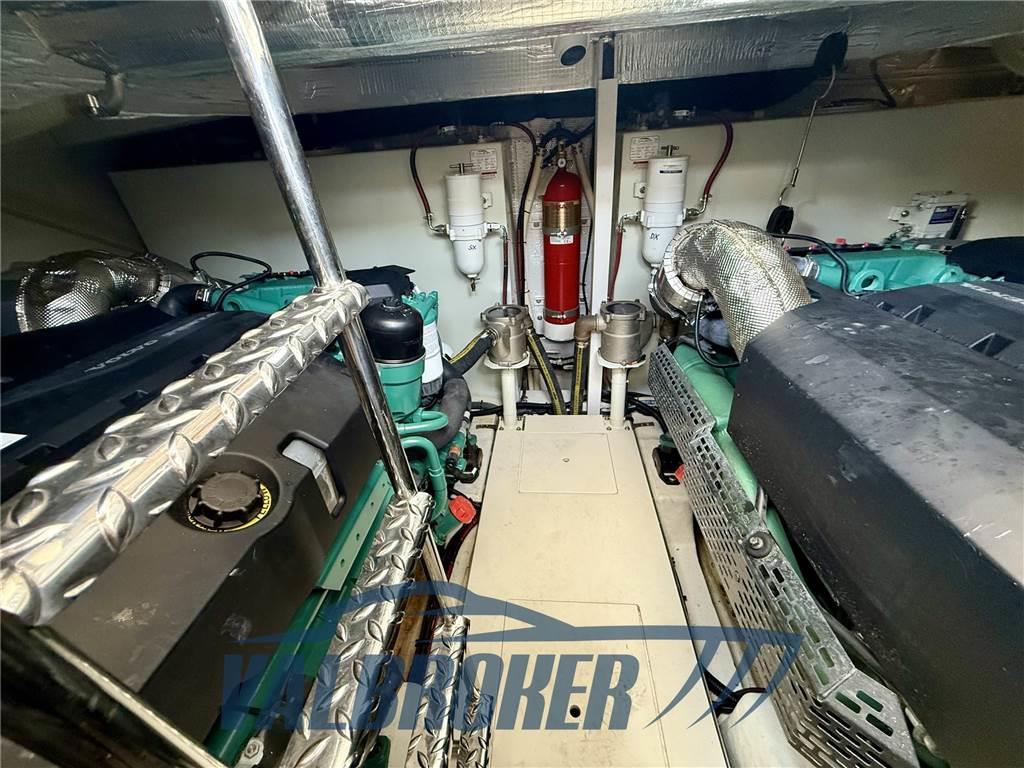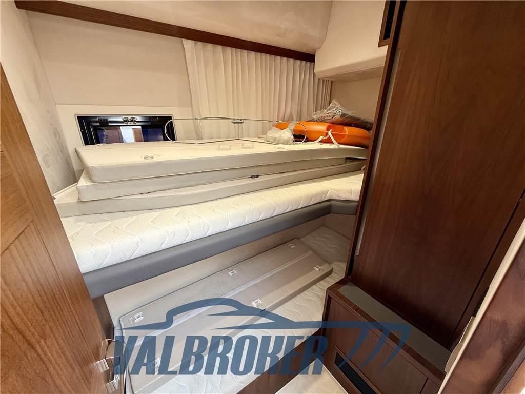 Galeon dal nuovo design che sfrutta al meglio tutto lo spazio a bordo. Finiture di alta qualità, grande abitabilità: cabina armatoriale a tutto baglio a centro barca con grandi armadiature, bagno ensuite con box doccia separato. Cabina VIP a prua con ampio letto matrimoniale, cabina ospiti lato di dritta con letti a castello. 2° bagno con doppio accesso e box doccia separato. Motorizzato 2xVolvo Penta D8 600 V8 turbodiesel in linea d'asse VDRIVE. FULL OPTIONAL: elica di prua e poppa, aria condizionata, generatore, garage per tender sgonfio, piattaforma tender lift.