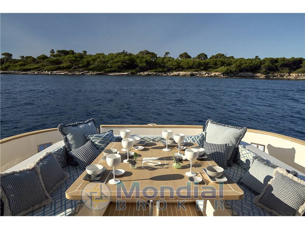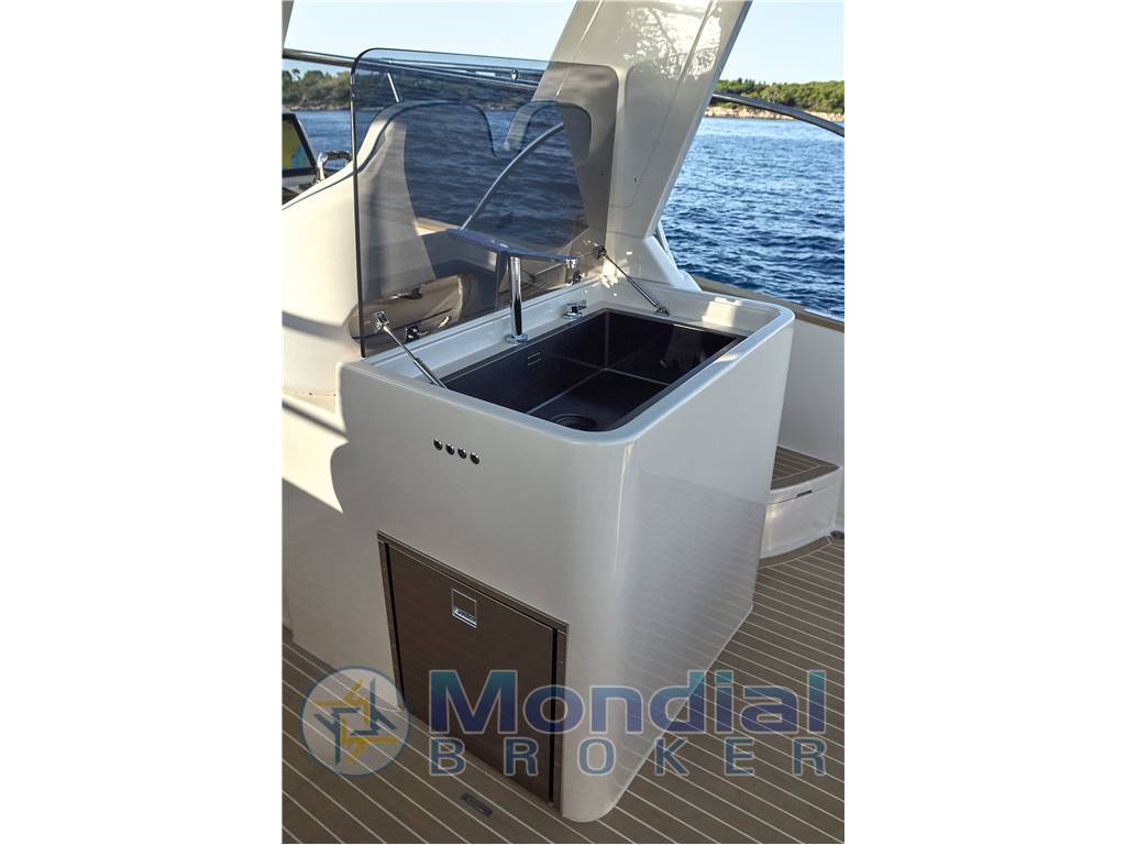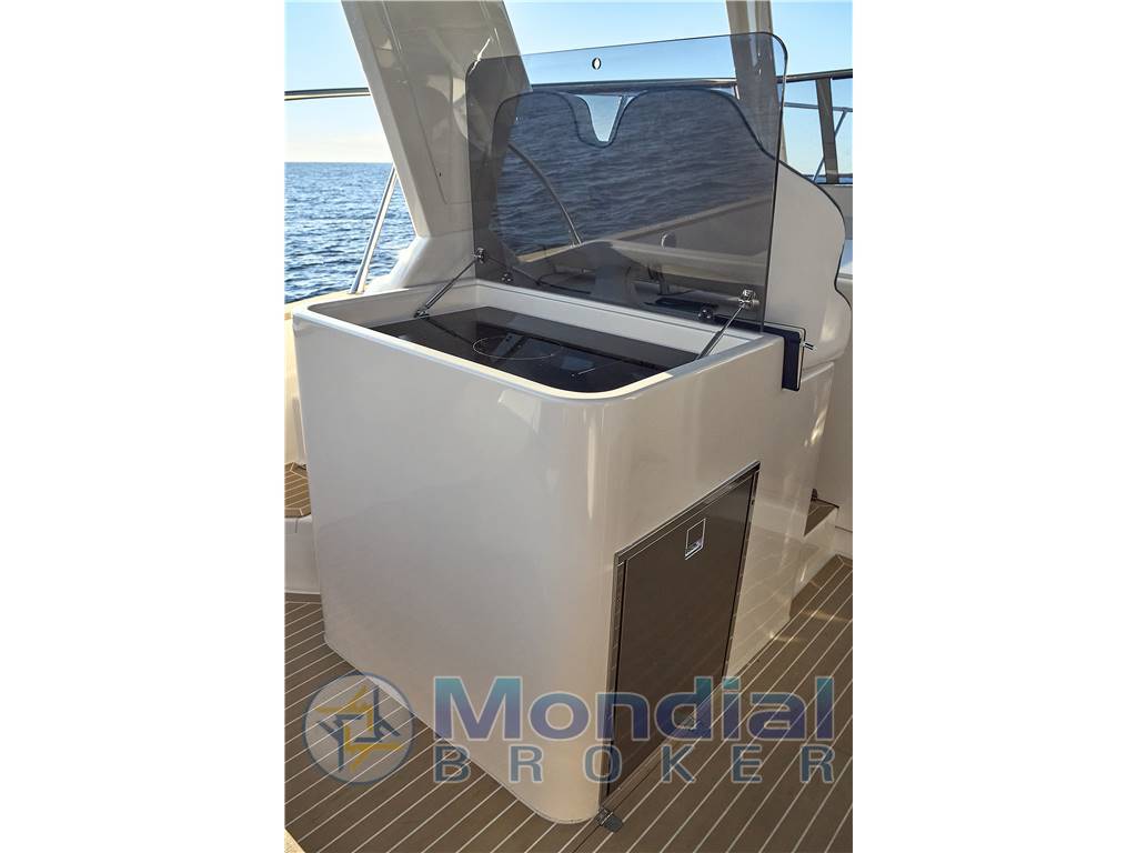 Il ponte di coperta presenta a poppa un'ampia spiaggetta che introduce al pozzetto protetto dalle alte murate e una dinette in grado di accomodare fino a otto persone, servita da un accessoriato angolo cucina protetto dal T-top.