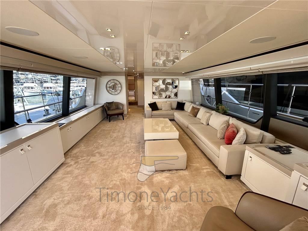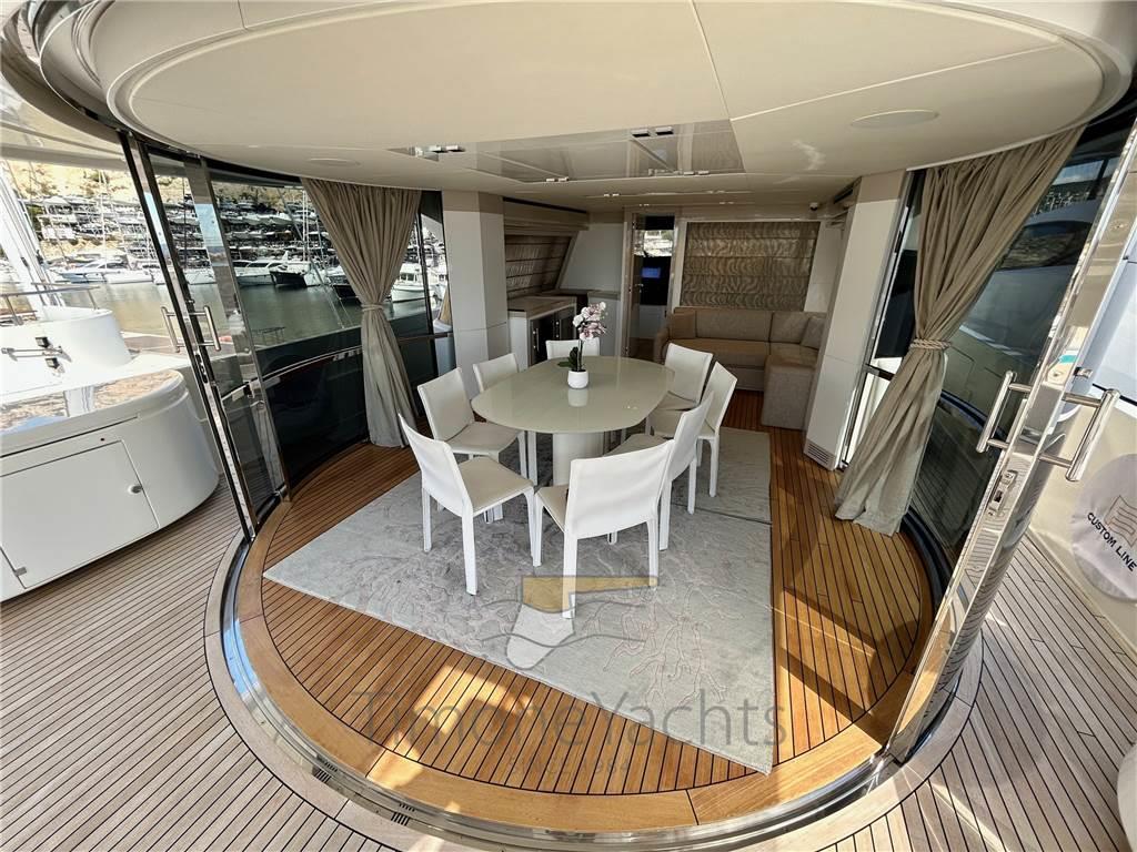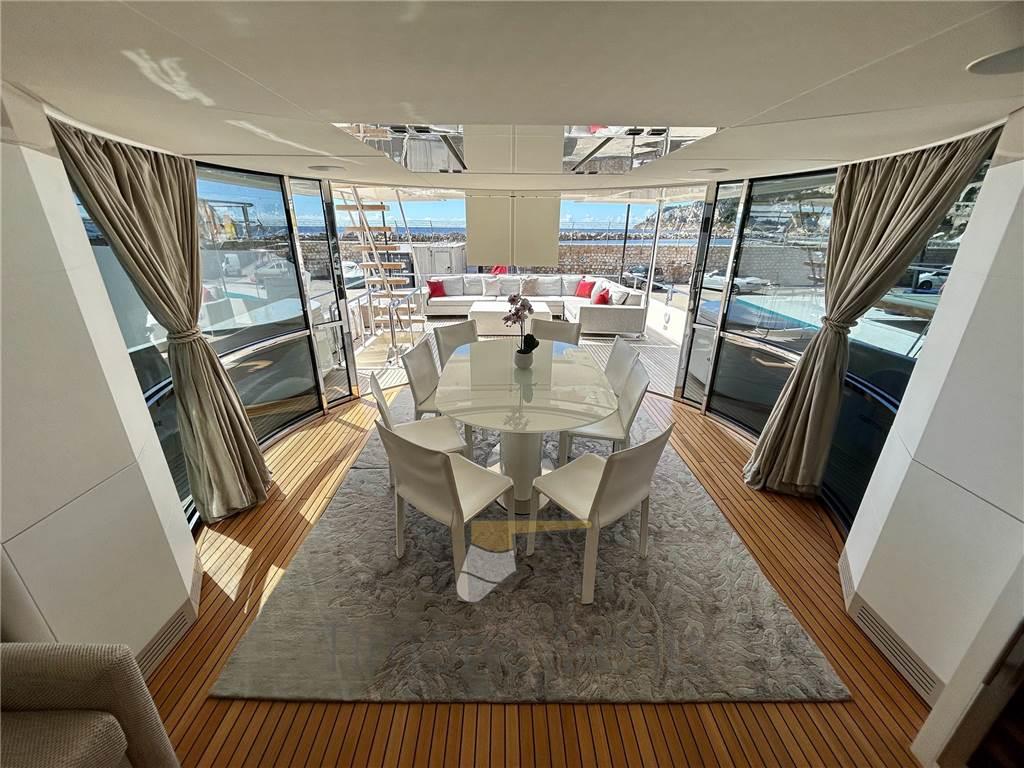Camminamenti laterali in teak, Doccia esterna, Elica di poppa - stern thruster, Elica di prua - bow thruster, Flap idraulici, Garage per tender, Hard top, Impianto antincendio, Indicatori Flaps, Lavaggio catena, Lavandino nel Pozzetto, Luci di cortesia, Luci subacquee, Passerella, 3 Porta laterale, Pozzetto Teak, Presa 220V banchina, Presa acqua banchina, 3 Stabilizzatori (ABT TRAC (underway + zero speed) + nr 2 Seakeeper NG9), Tavolo pozzetto, Tender, Tromba, 2 Winch tonneggio di poppa, 2 Winch tonneggio di prua.