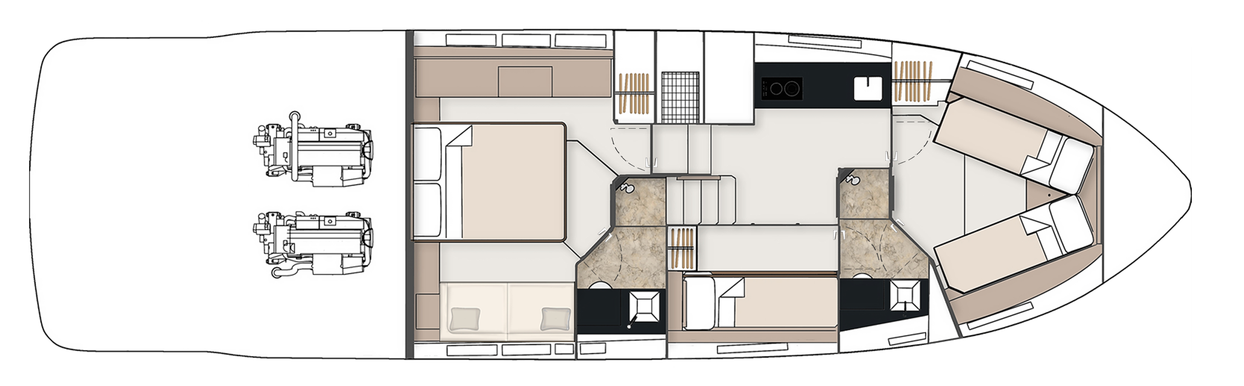 Cabina matrimoniale a centro barca con bagno e box doccia