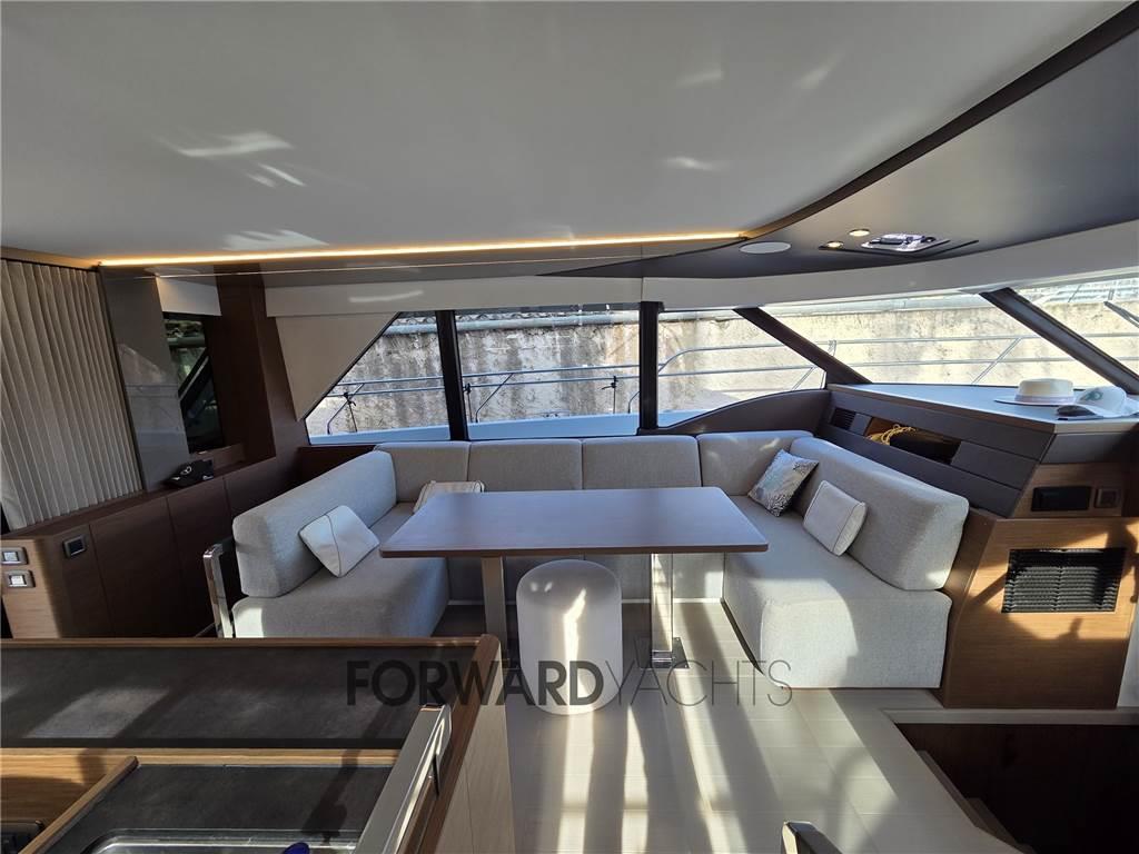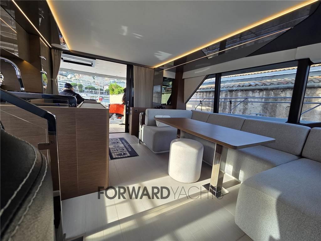 - Ampia dinette a centro barca con grande tavolo da pranzo circondato da un divanetto a U completato sul quarto lato da tre sedute. A dritta è prevista la postazione interna per il timoniere, mentre la cucina è collocata nella zona poppiera della dinette. In questo modo risulta a ridosso della zona pranzo, ma anche del pozzetto.