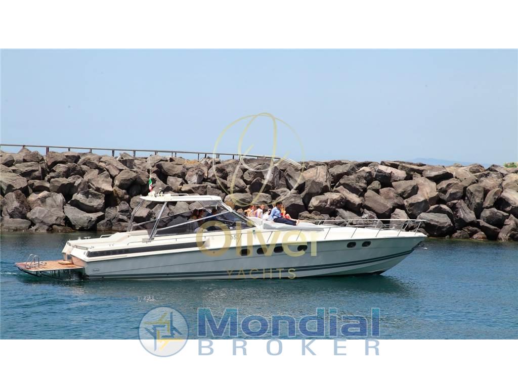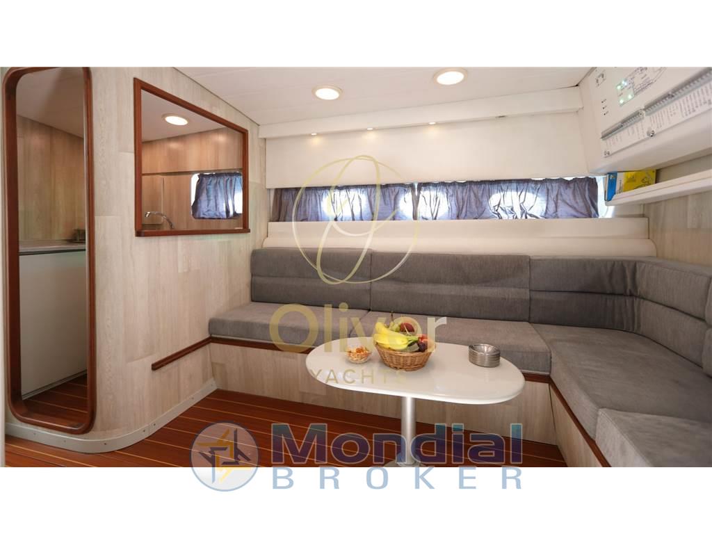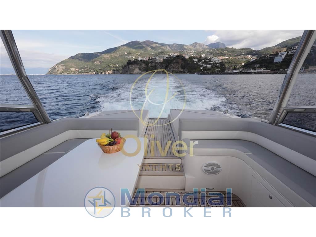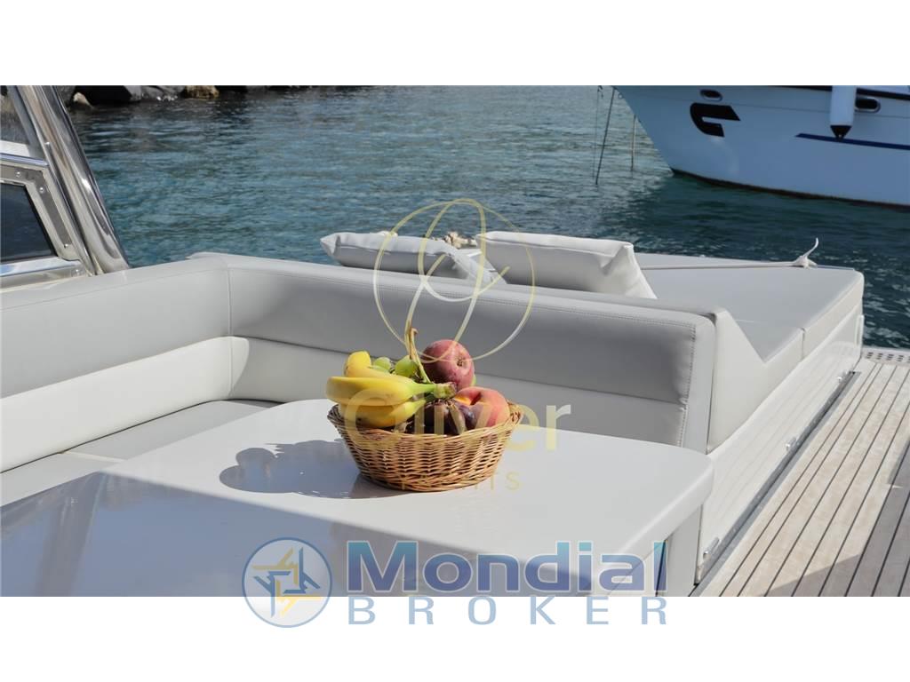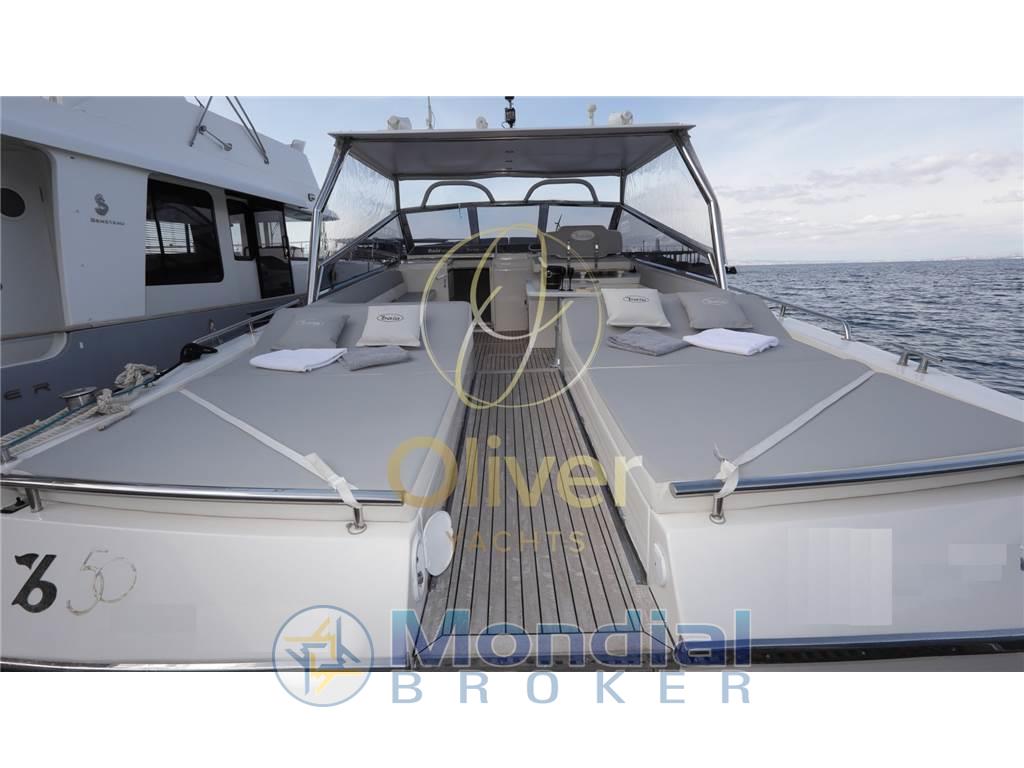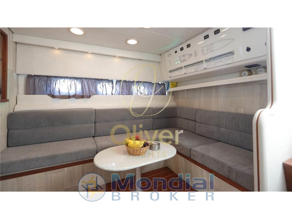 Questo esemplare in particolare, costruito nel 1990, ha beneficiato di un refit totale nel 2019, che ne ha completamente rinnovato lo stile e le dotazioni. Tra le modifiche principali spiccano l’installazione di un hard top rigido, l’aggiunta di vetri in cristallo per una maggiore luminosità e visibilità, e una nuova struttura in acciaio AISI 316. Il passaggio a prua è stato reso più agevole grazie all'apertura centrale, mentre la vivibilità in banchina è migliorata con una passerella a scomparsa PIN Craft perfettamente integrata. A poppa, i portelloni elettrici, la cuscineria doppia, l’ampio prendisole e il rivestimento in teak completano un layout da cruiser sportivo di prestigio.