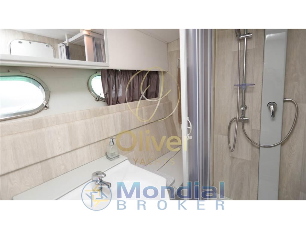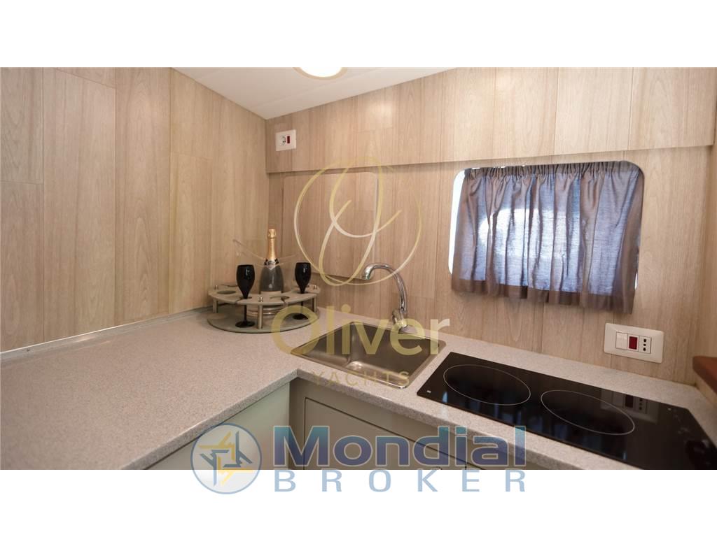 Il bagno è stato completamente ridisegnato e posizionato sulla sinistra, al posto della precedente cabina ospiti. Ora offre una doccia separata, lavello moderno e servizi in stile contemporaneo, con ottimizzazione dello spazio e praticità d’uso. Al posto del vecchio bagno è stata ricavata una cucina separata, dotata di doppio piano cottura, frigorifero a cassetti e numerosi vani contenitori. Questa configurazione offre maggiore privacy tra gli spazi di servizio e quelli dedicati alla vita a bordo.