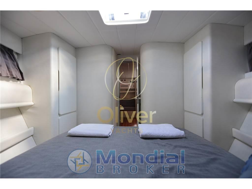La zona notte include una cabina armatoriale ben proporzionata, con letto matrimoniale e armadiature, rifinita con tessuti e superfici coordinate. È presente anche una cabina singola per il marinaio, accessibile separatamente, che può essere utilizzata anche come vano tecnico o ripostiglio.