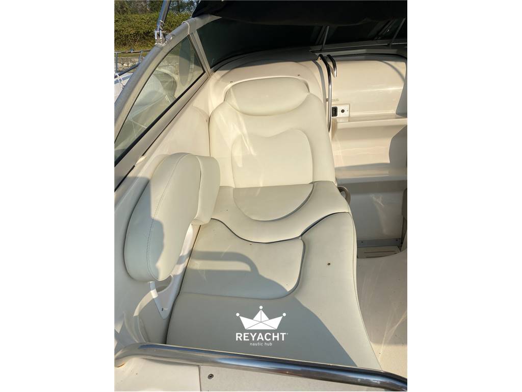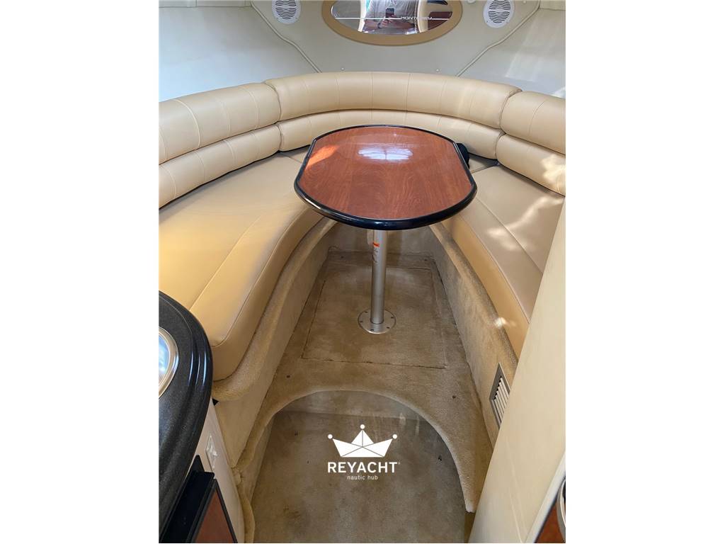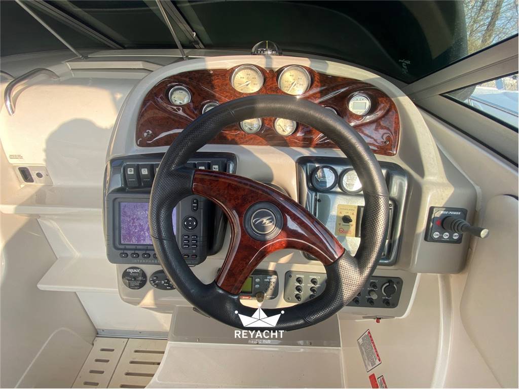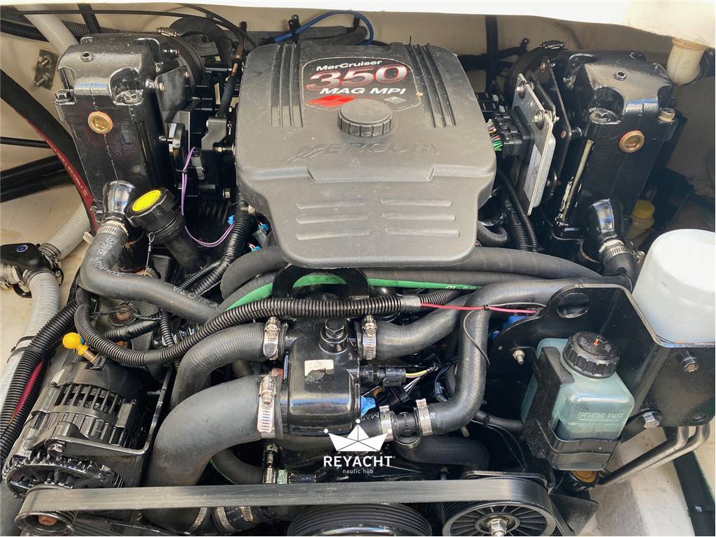 Coque et pont en fibre de verre, design équilibré et marin. Motorisation Mercury 454 CID – 350 HP, 283 heures, embase stern drive, essence, consommation env. 35 L/h. Vitesse de croisière 26 nœuds, max 36 nœuds.