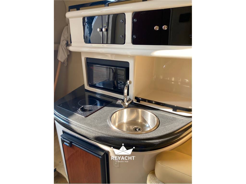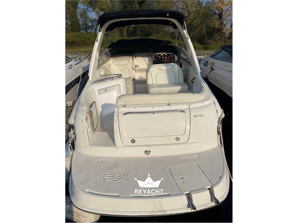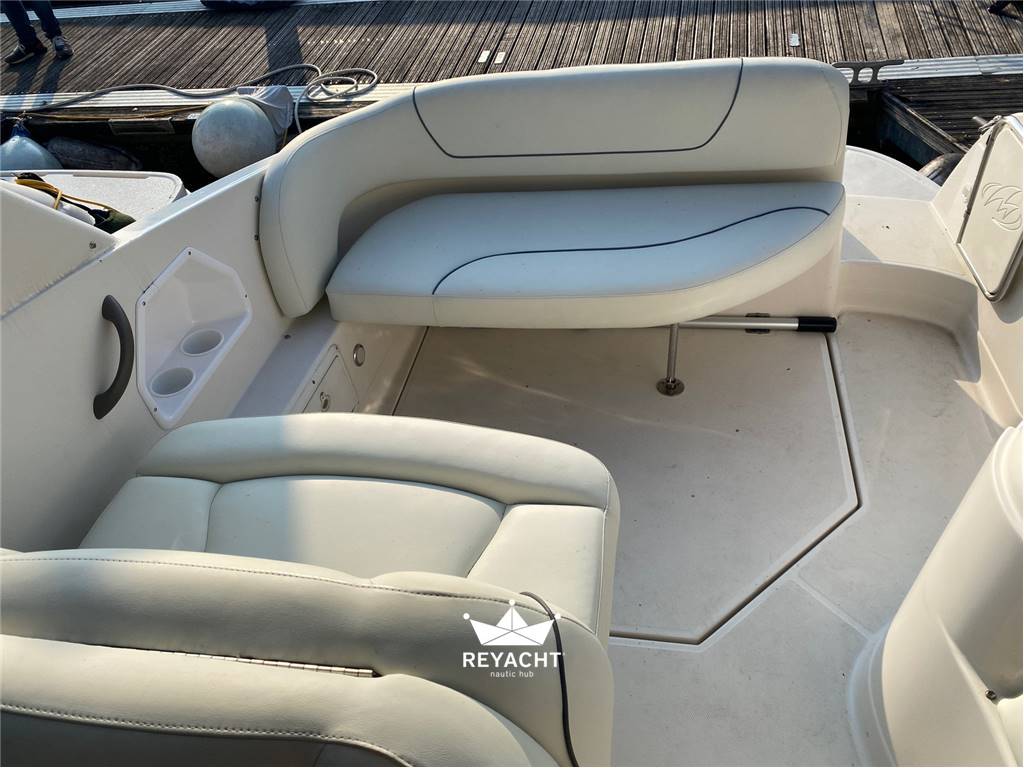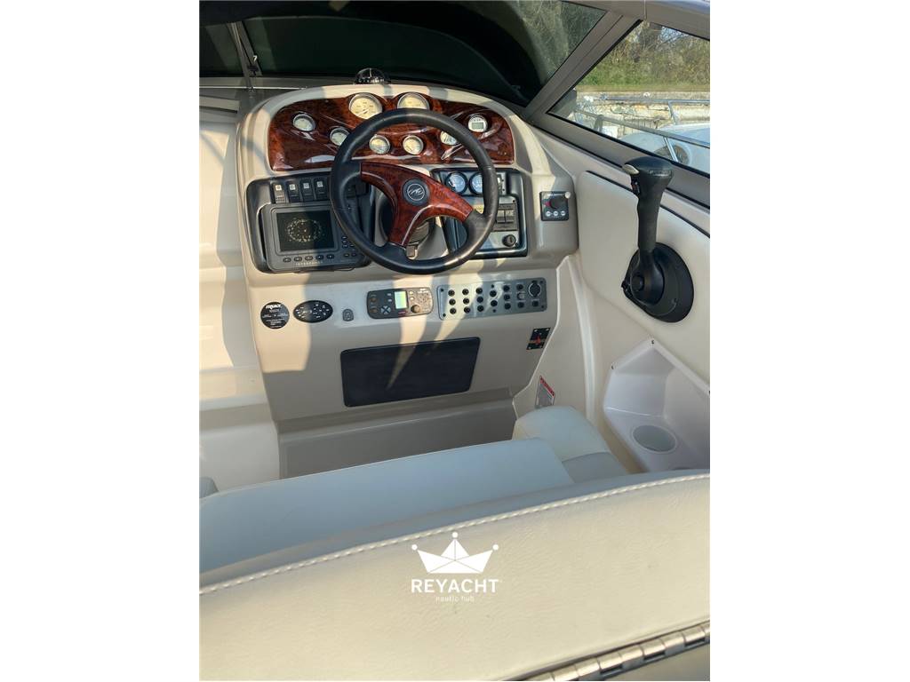 Coque et pont en fibre de verre, design équilibré et marin. Motorisation Mercury 454 CID – 350 HP, 283 heures, embase stern drive, essence, consommation env. 35 L/h. Vitesse de croisière 26 nœuds, max 36 nœuds.