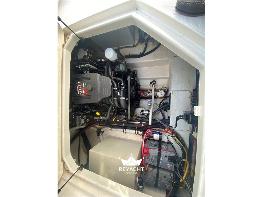 Carena in vetroresina con linee performanti e coperta ergonomica. Motorizzazione Mercury 454 CID da 350 HP con sole 283 ore moto, piede poppiero, alimentazione a benzina, consumi medi di 35 l/h. Velocità di crociera 26 nodi, massima 36 nodi.
