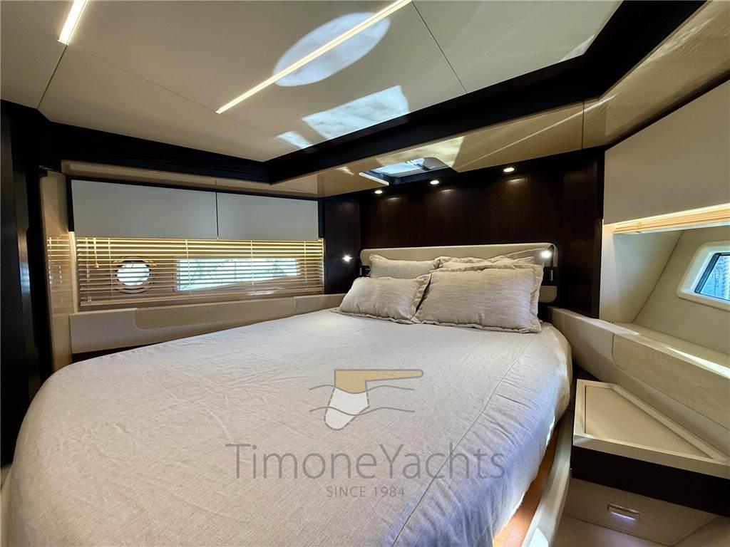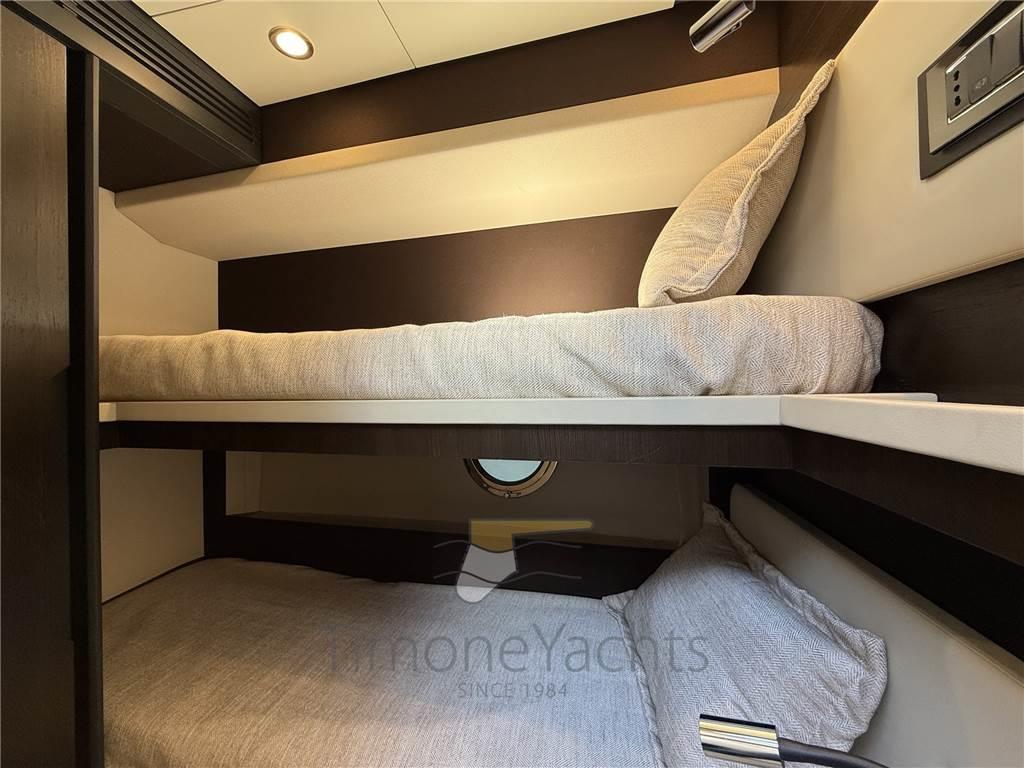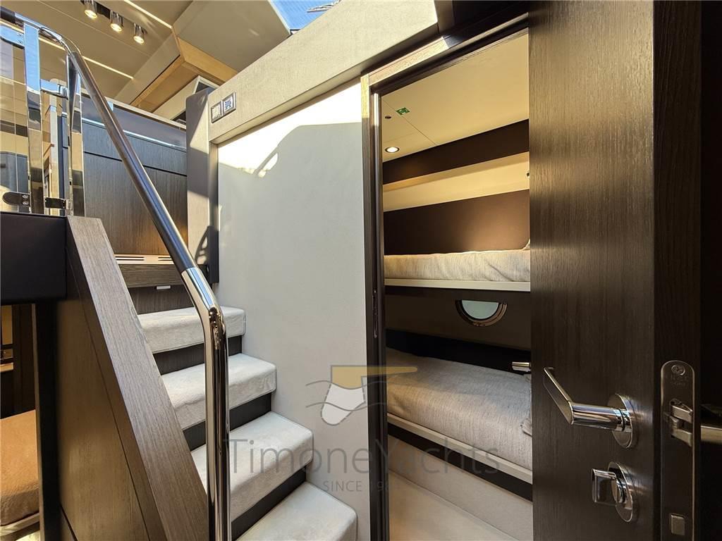 4 cabine + 3 bagni, un ampio salone e una cucina importante al piano principale. Il pozzetto è confortevole, il flybridge è ancora meglio e la prua è ampia e accogliente, con quella vista laterale a "palla di cannone": prendisole + divano, tutto a portata di mano. Master a centro nave, vip a prora, ospiti con i due letti gemelli in murata dx, ospiti con i due letti a castello in murata sx.