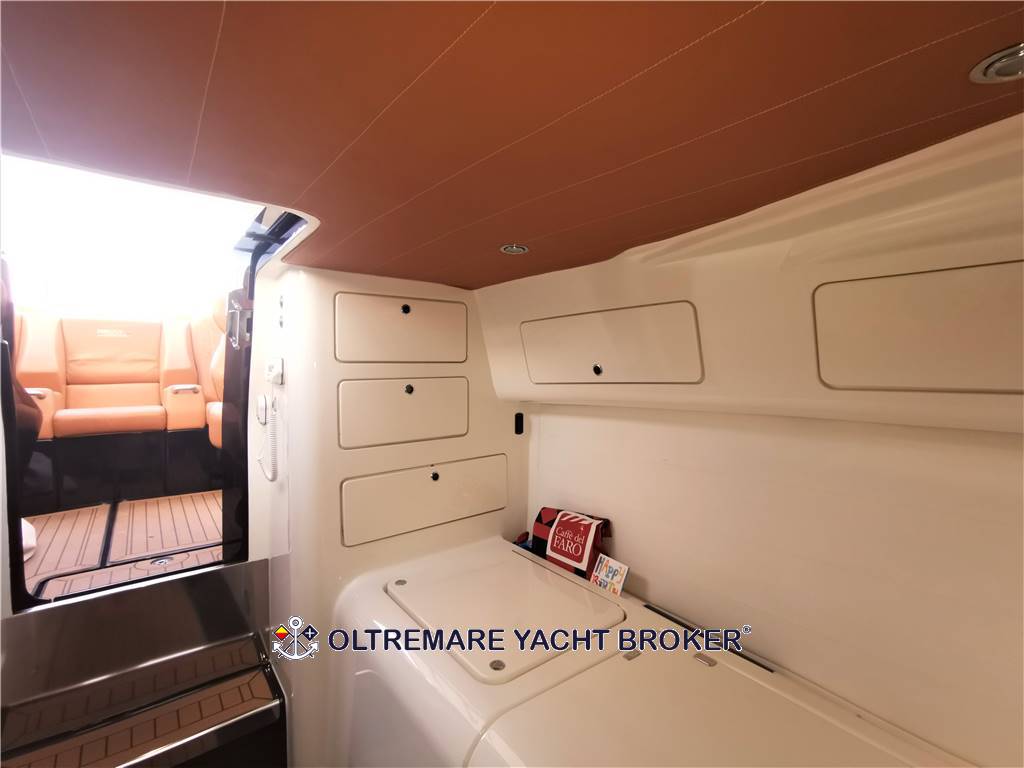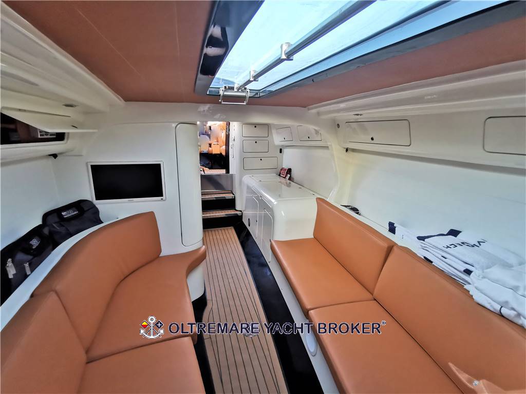 Speciali sedili mettono gli ospiti a proprio agio per far loro provare l’ebbrezza di volare a 85 nodi (autolimitati) sull’acqua, una prestazione paragonabile a quella di un’auto da corsa lanciata a oltre 300 Km/h. In rada o in banchina si coglie il piacere di un drink nel pozzetto o seduti sui divani sottocoperta, ci si abbronza sui materassini prendisole a poppa o sul ponte di prua, mentre per scendere in acqua o risalire a bordo si utilizzano le pedane e le scale disegnate sulla lunga coda. Il design sportivo è addolcito da sinuose curve che plasmano il ponte e i passavanti. Il parabrezza protegge l’equipaggio avvolgendolo come in un abbraccio. In cabina si apprezza il piacere del lusso e di una comoda cuccetta per la notte. L’opera viva è dotata di due redan e di innovative prese d’aria collegate al piano di coperta e derivate dal modello da competizione che consentono la iperventilazione dello scafo per raggiungere prestazioni imbattibili.
