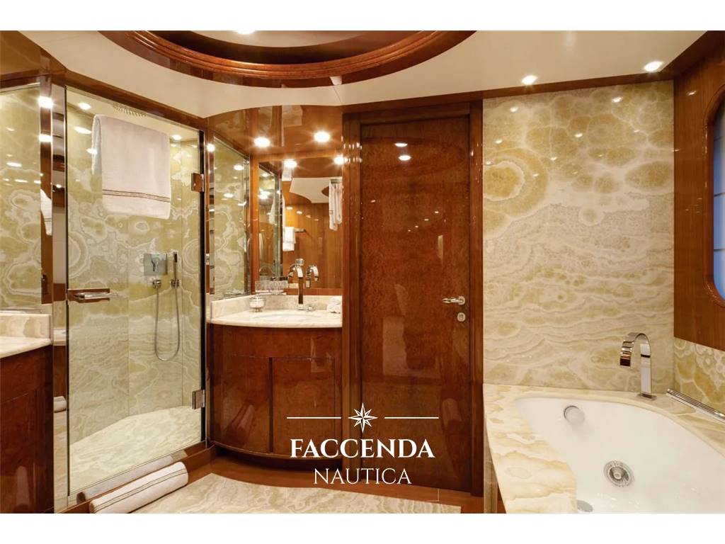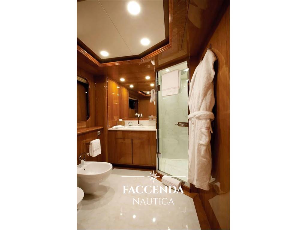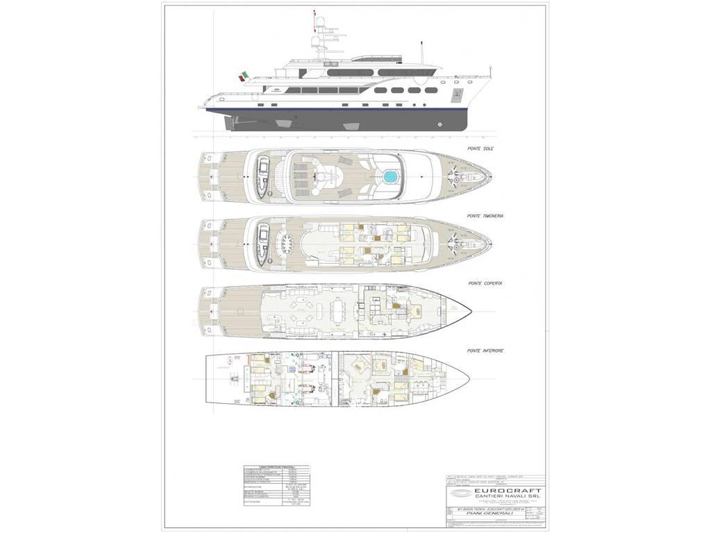 MACCHINE AUSILIARIE Sistema di governo: Timone a mano in funzionamento normale dalla timoneria o dalle ali e timone a mano in emergenza nella sala di controllo, pilota automatico da sistemare sulla timoneria Elica di prua: NAIAD MARINE VT 75 - 83 kW Stabilizzatori: Sì, Zero speed, Tipo Quattro idraulici NAIAD MARINE Modello 525 0 velocità Comandi timone/stazione d'ala: Sì Sistema carburante e olio Filtri carburante: Filtri Racor duplex Separatore olio combustibile: CJC PTU 1 27/54 Pompa di trasferimento carburante: Trilub 140R46U8 6-V-W115 Pompa di rifornimento carburante: Sì Separatore acqua di sentina oleosa: Sì Pompa olio sporco: Sì Sistema antincendio e di sentina Pompa antincendio e di sentina: Sì Sistema di acqua dolce 1 x Seafresh H206A.F 440 lt/hProduttori di acqua dolce: Sì Trattamento dell'acqua dolce: Si Pressione dell'acqua dolce: 2 x Calpeda B NG 6/22/A 230/400 V 3F 50 Hz 1,5 Kw Pompa di circolazione calda e fredda: Gianneschi Z40 230/400 V 3F 50 Hz, , ERC 5H 400-3 X EL630 Ventilatori di scarico Sì Caldaie per acqua calda: 2 x Gianneschi Sistema di acque nere e grigie Sì Trattamento delle acque nere e grigie: Triton WC (toilette/bidet): EVAC Sistema di vuoto sanitario: Sì Pompe di scarico delle acque grigie: Sì Sistema di condizionamento e ventilazione FRIGIT Aria condizionata: Sì Compressore d'aria: Mattei Fornitura Refrigerazione: Sì Ventilazione sala macchine: 2 x Gianneschi Sistema idraulico Centraline idrauliche.